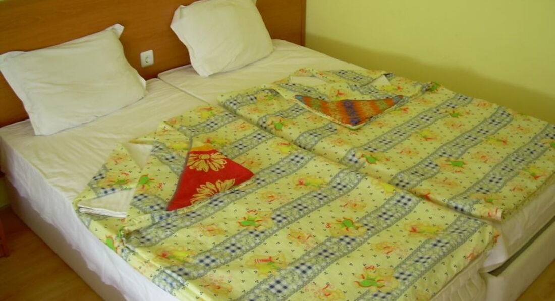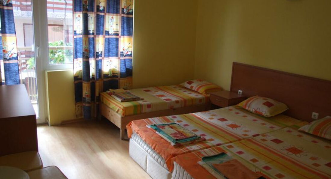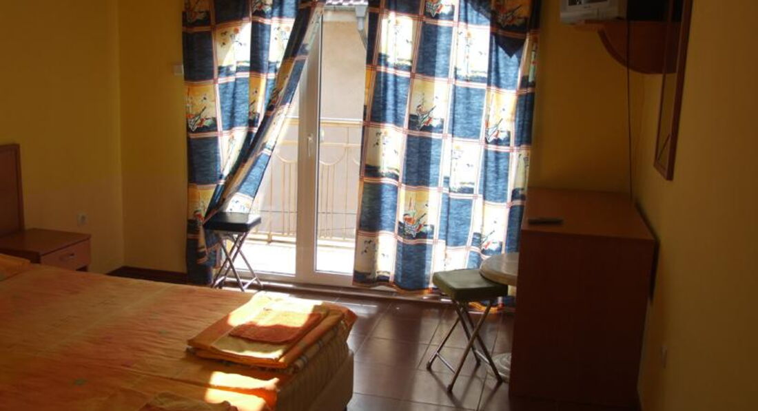 Были в этом отеле с 4 по 18 августа- я и двое детей. Сразу скажу, если вы ценитель комфорта, если вам тяжело или лень ходить далеко- вам не сюда! До моря реально далеко, хотя мы никогда не берем первую линию, но здесь явно не 800 метров, в жару тяжело возвращаться. Но для нас это был единственный минус. Заселили нас в номер 205 с видом на внутренний двор.Номера простые, без излишеств. Может быть в разных номерах разные подушки, но у нас были малюсенькие и мягкие. В номере 3 кровати, стол, 2 тумбочки, телевизор вверху на полочке, при входе- шкаф с отвалившейся задней стенкой. В ванной раковина, унитаз и душ с дыркой в полу, когда моешься- на полу "болото". Wi-Fi в номере (роутер на балконе) ловит хорошо. Мы были первый раз в Болгарии, и поэтому взяли завтрак- ужин- не берите, приходится быть привязанным к месту и ко времени. Хотя кормили сытно и разнообразно. За 2 недели полностью не повторилось не одно блюдо!!! Порции большие. Дети иногда не доедали, так хозяева беспокоились, что не понравилось. Сказали, если мы что не едим, они готовить не будут. Хозяева очень внимательны и добродушны, всегда стараются угодить. Мы приехали поздно, нас накормили ужином и дали в долг воды (левов у нас еще не было). Пляж большой и широкий, есть платная зона и бесплатная, мы купили зонтик и ходили на бесплатную. С пляжа обедать шли в "Болгарку", она рядом с центральной улицей. Очень вкусно и не дорого. Самостоятельно ездили в Варну, остановка проходящих маршруток недалеко от отеля, проезд 4 лева, погуляли в Приморском парке, зашли в зоопарк, в дельфинарий не пошли, надо было ждать представления, прошлись по центру. Зашли в информационный пункт, там нам подсказали как вернуться в Кранево и добраться до картинга в Виннице (там самый крутой картинг). Съездили на картинг- дети были в восторге! Сами ездили в аквапарк в Золотые пески- можно не ездить- отстой! К часу даже детям надоело. Решили сходить в Аладжа- монастырь, на указателе было написано- 3 км. Не верьте указателям в Болгарии. В результате туда- обратно вышло километров 12! Хорошо, нам обратно подсказали дорогу через лес, там хоть не жарко было! Познакомились с местным жителем и в Балчик, Калиакру и Побитые камни ездили с ним (могу дать телефон). Экскурсии никакие не брали, машину напрокат тоже (после того, как на наших глазах две девчонки на четырехколесном велике снесли машине зеркало и поцарапали бок)! Болгария мне понравилась, отель тоже. Приятного отдыха!