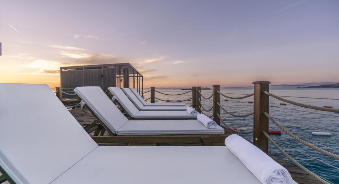 • пляж є дерев'яний настил на скелястому березі. Захід у море — кількома драбинками. На пляжі можна орендувати дерев'яні павільйони з кріслами та столом. Рушники безкоштовно