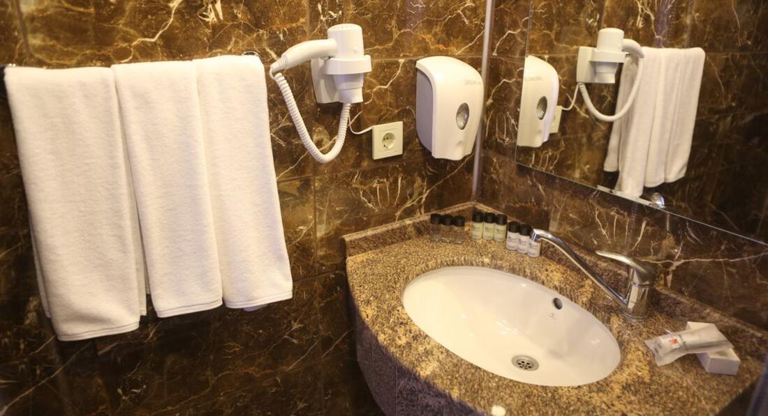 • ванна кімната з феном, халатами