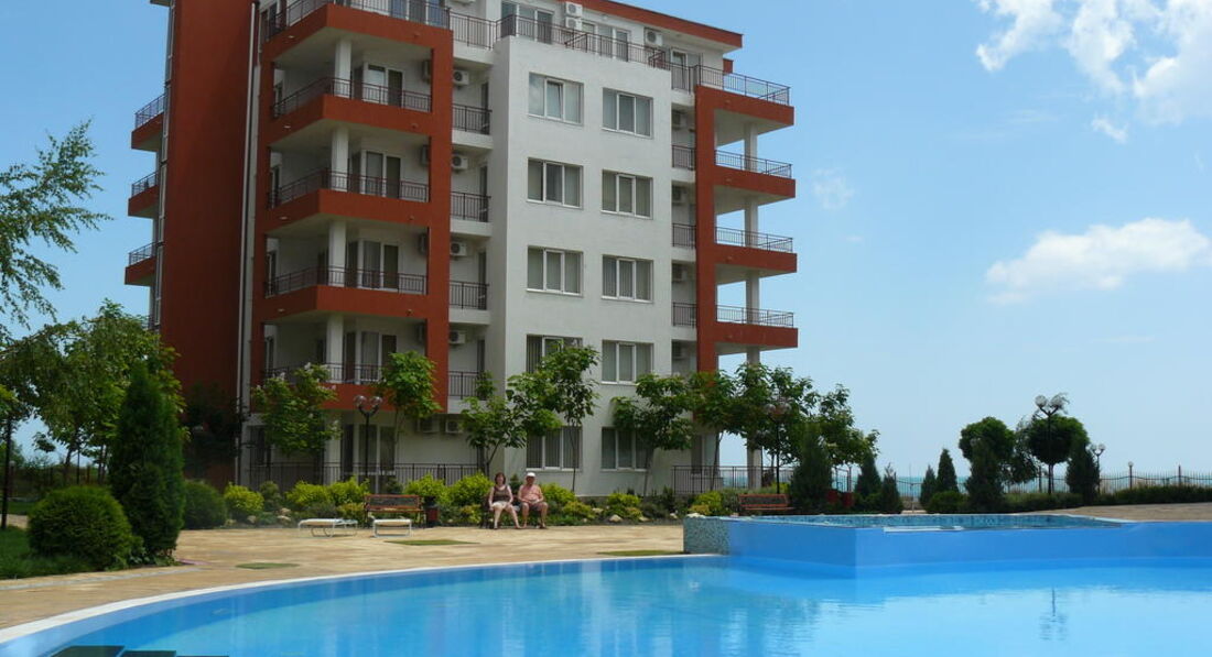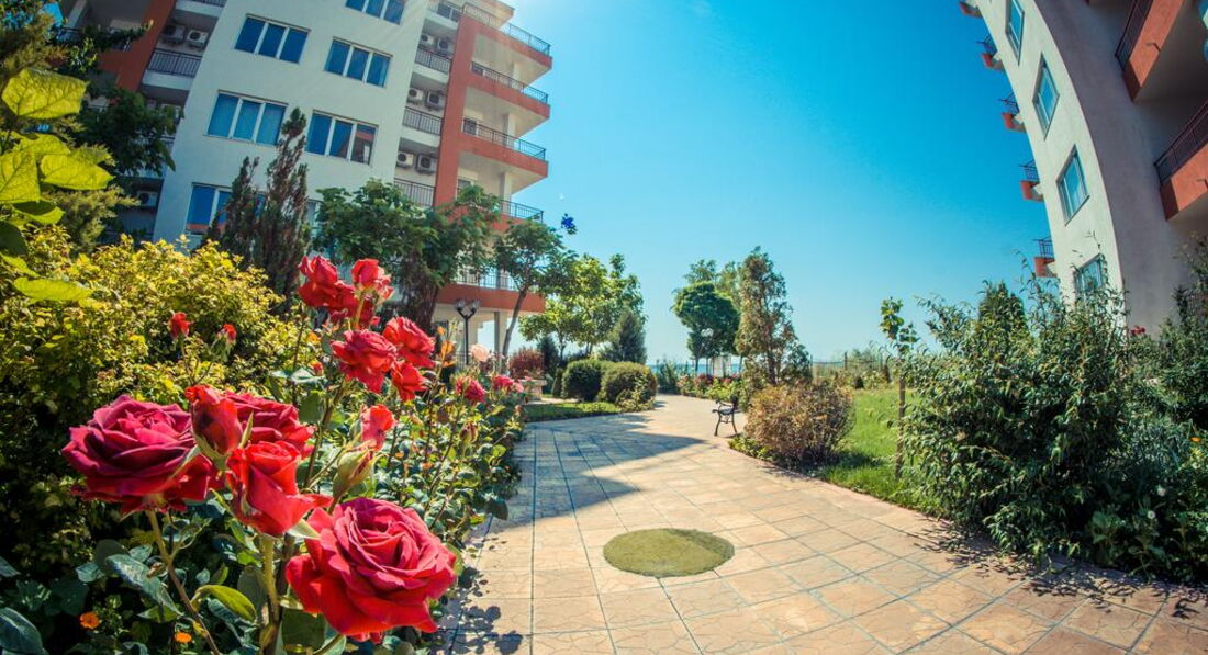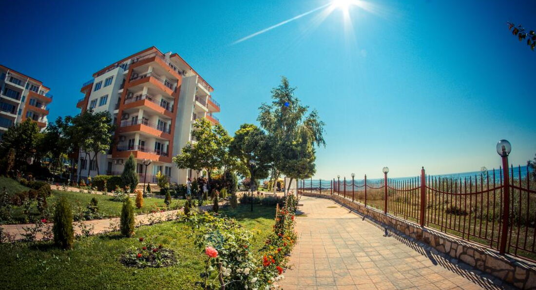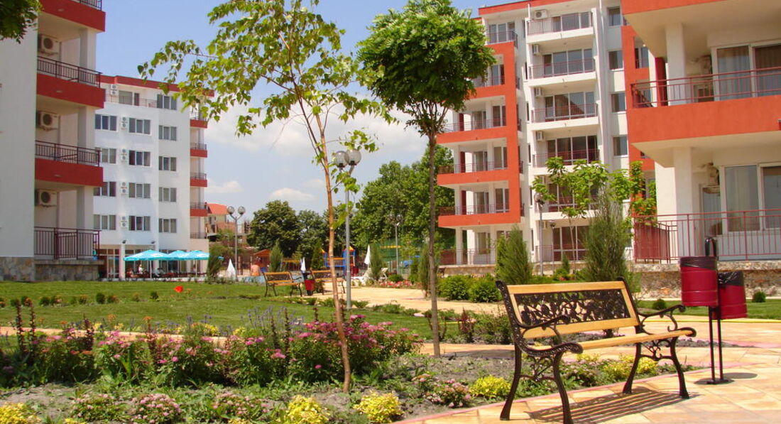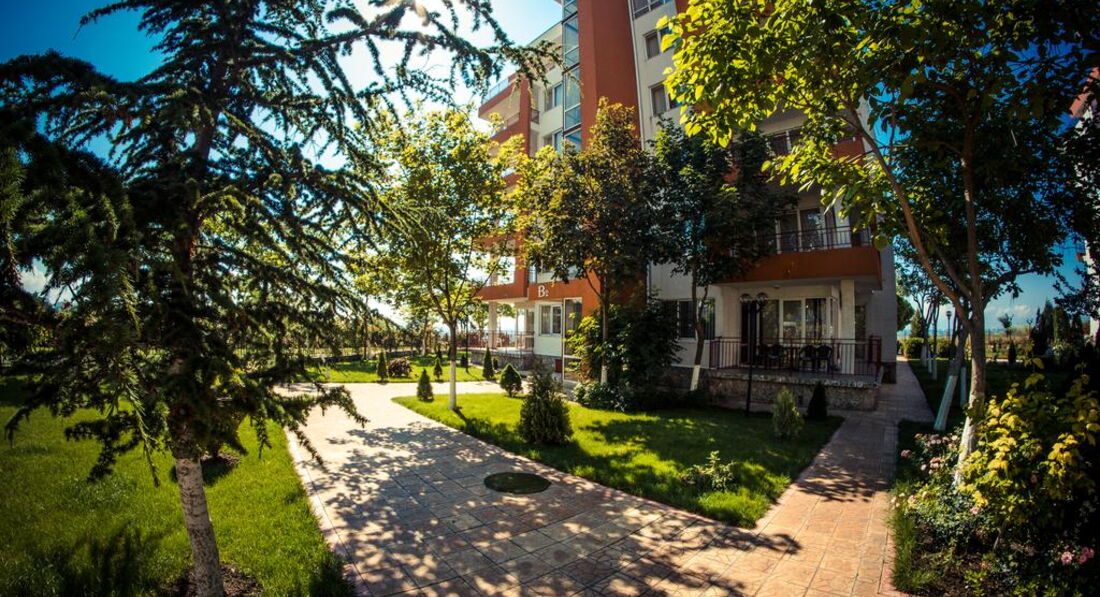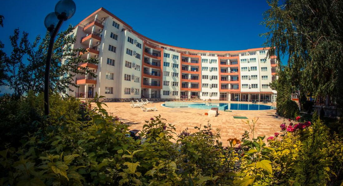 Комплекс (состоит из большого корпуса А1 и 2-х "свечек" В2(ближе к морю) и В2) расположе: в 20 км от аэропорта Бургаса в поселке Равда- на такси 40лев (местная валюта 1 лев=0,5евро) - 20 минут без пробок.