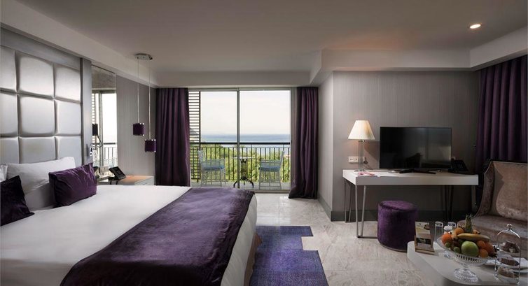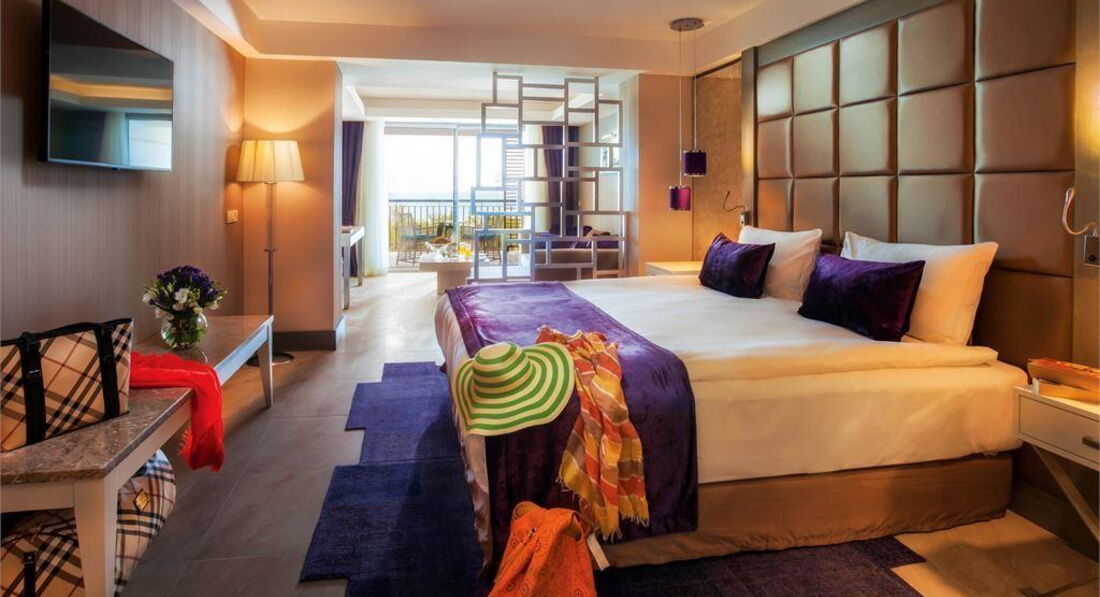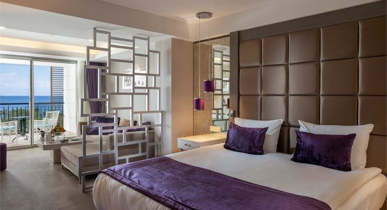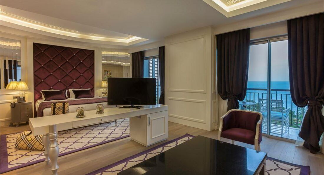 1 King Suite (232 м2) 2 спальні, вітальня, розділені дверима, м'які меблі, 3 ТБ, ванна та душова кімнати, тераса, макс. 6 чол.