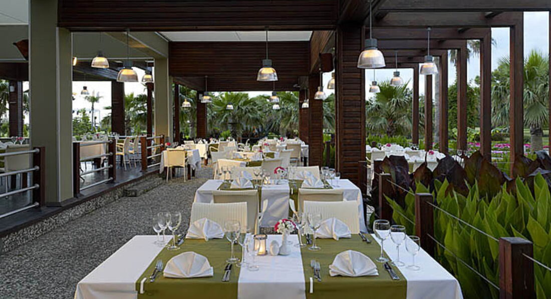 Бари та ресторани: головний ресторан розрахований на 700 осіб (критий, з кондиціонером, літня тераса, дієтичне меню, дитячі стільці); лобі-бар (09:00-24:00), бар біля басейну (10:00-18:00), бар на пляжі (10:00-18:00), диско-бар (23:00-02:00) ), вітамін-бар (10:00-18:00, свіжі соки - безкоштовно). 3 ресторани A la Carte: турецький, італійський, далекосхідний - безкоштовно.