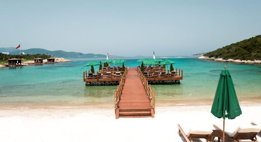 Отдыхали в Rixos Premium bodrum в конце мая 2018, с мужем и ребёнком . от аэропорта ехали минут 15-20. Отель сам по себе шикарный, неописуемая природа, ящерицы, белки , постоянно орет какой-то филин )) Море чистейшее, заплывая от берега метров на 30, можно отчетливо разглядеть, что на дне. Есть собственный остров с бунгало, бунгало можно арендовать, стоит самый дешевый пакет от 150$, по сути делать там особо нечего кроме как красиво Пофоткаться. Пляж с белым песком толко для проживающих на вилле, нам туда вход был закрыт. Бары на каждом шагу, алкоголь мега-качественный и на любой вкус. Бейлис, Гавана клаб, кампари, чивас, мартини асти и тд.. везде официанты , и в ресторанах и у бассейна и на пляже , все приносят, уровень обслуживания просто высший класс.
