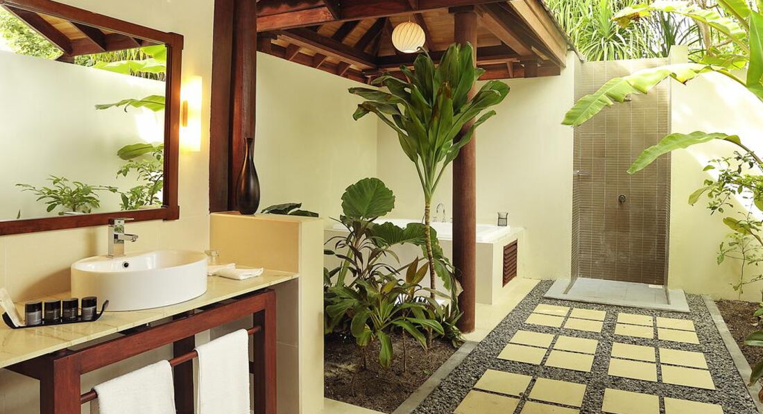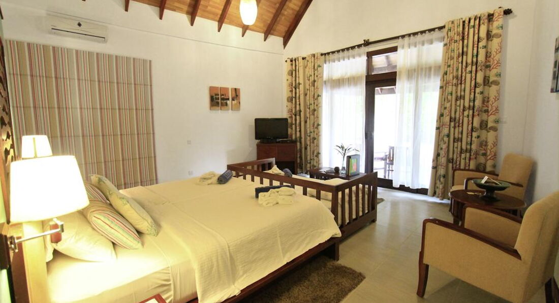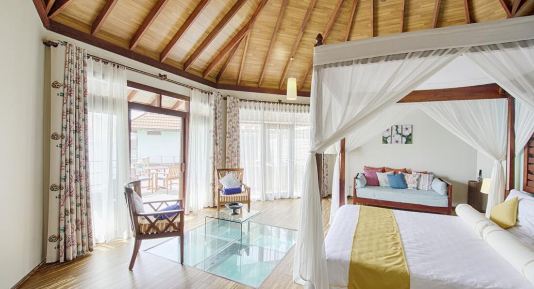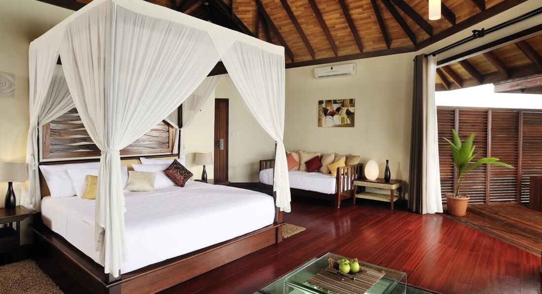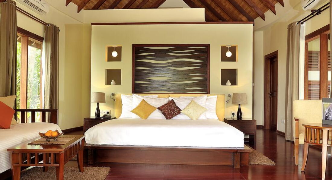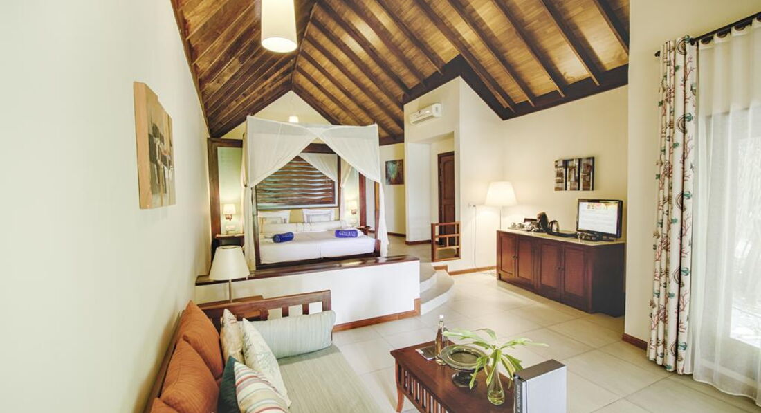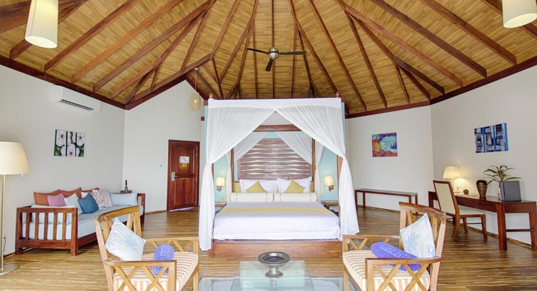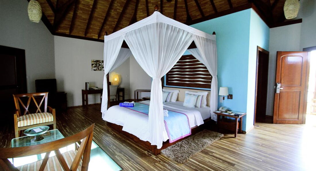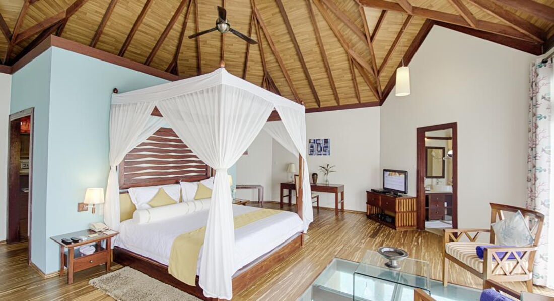 Типи номерів: 26 Garden Villa (90 м2, макс. 3 або 2+1 чол.). Вілли в саду, розташовані на відстані від пляжу, згруповані в блоки по 2 номери. У ванній кімнаті є душ (на відкритому повітрі) та ванна з джакузі. 18 Beach Bungalow (97 м2, макс. 3 або 2+1 чол.). Просторі берегові вілли з прямим виходом до пляжу згруповані в блоки по 2 номери. Усі номери суміжні. У ванній кімнаті є душ (на відкритому повітрі) та ванна з джакузі. 32 Beach Villa (117 м2, макс. 3 або 2+1 чол.). Аналогічні вілл категорії Beach Bungalow, але більше за розміром. 24 Lagoon Villa (115 м2, макс. 3 чол.). Водні вілли, що окремо стоять, з терасою і прямим спуском у воду. У вітальні – прозора панель у підлозі з чудовим оглядом підводного життя рифу. Спальня з ліжком king-size з балдахіном, ванна кімната з ванною. 1 Lagoon Suite (270 м2, макс. 6 чол.). Водна вілла з панорамним видом, 2 спальні (у кожній – ліжко king-size з балдахіном), окрема вітальня, простора тераса з басейном та джакузі, прямий спуск у воду.У номері: