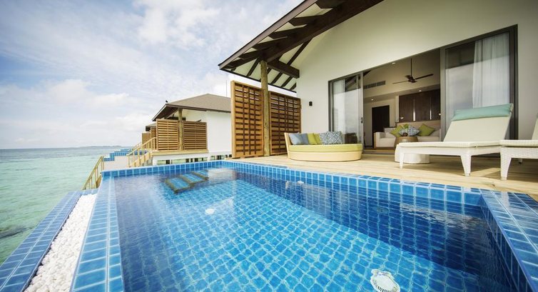 • OVEWATER POOL BUNGALOW номер: 93 кв.м, однокімнатний; спальня, ванна кімната, власний басейн, тераса з видом на море