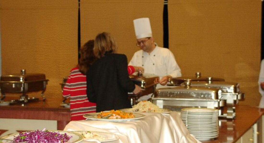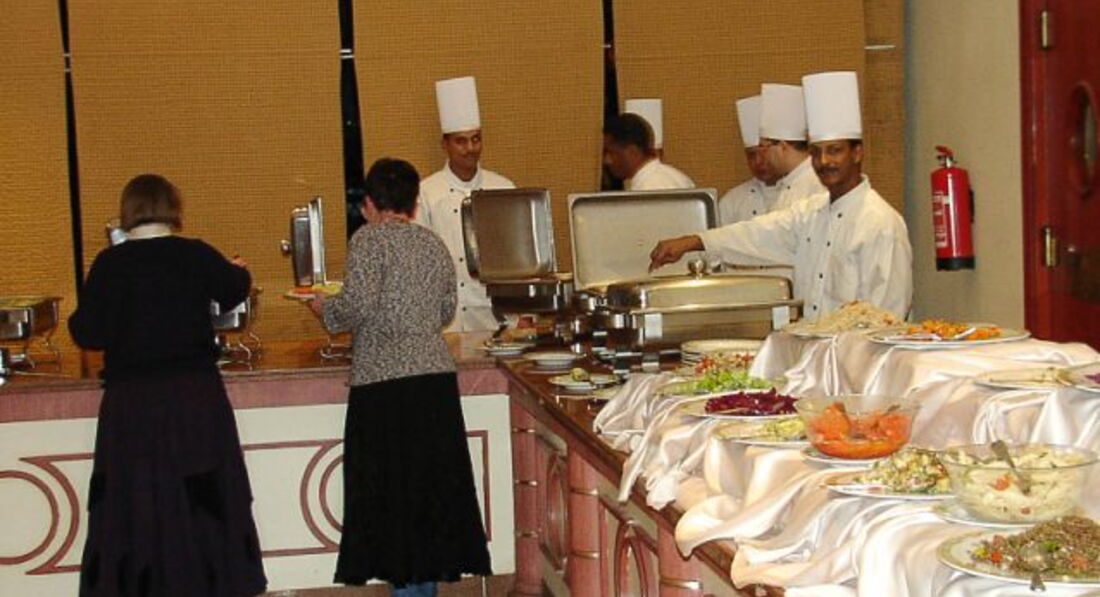 Вообще попытка покушать там - это сплошная охота. Обед начинается в 13:00. К 14:00 уже почти ничего не остается. Та же история с ужином. Минут за 30 до начала все люди выстраиваются перед дверями ресторана, и как только тот открывается - все несутся в попытке хоть что то схватить.
