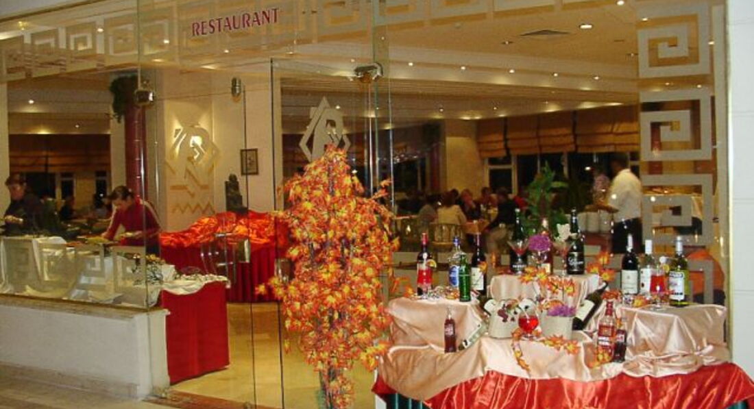 Харчування: система "все включено": сніданок, обід, вечеря - шведський стіл у головному ресторані, прохолодні напої (кола, фанта, спрайт, каркаде, мінеральна вода), чай, кава, гарячий шоколад, вино та пиво місцевого виробництва, а також наступні алкогольні напої місцевого виробництва (віскі, ром, узо, горілка, бренді, джин) у ресторані під час обіду та вечері та у барах у години їх роботи з 10:00-23:00. Усі напої подаються у склянках (на пляжі у пластикових). Платно: свіжі соки, коктейлі.