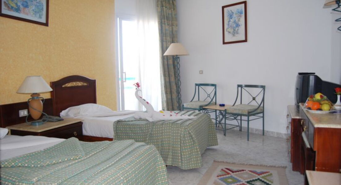 Отдыхали в июле 2015 года с друзьями. По приезду нас сразу заселили и покормили. За дополнительную плату нам достались номера на 4-ом этаже с видом на море.Мебель старая, но в принципе нормальная. Главной проблемой стало отсутствие водоснабжения на 2 дня. Нигде не было в отеле воды вообще.Это был ужас.Мы постоянно ходили и ругались. На пляже большой бассейн закрыт на реконструкцию. Плавали иногда в маленьком.Часть лежаков сломана.Пиво на пляже заканчивалось через 10 минут после открытия бара.Море нормальное, только много кораллов. Сразу рекомендую покупать тапочки.Кормили нормально, голодными не ходили. Уборка номеров ужасно...Они вообще делали только видимость, что убирают. Постель и вовсе не меняли, несмотря на оставленные чаевые. Также было много отдыхающих арабов. На пляже аниматоры проводили гимнастику, так арабы снимали девочек на мобильные телефоны...и смотрели на девушек постоянно.Было не приятно...В целом наш отдых прошёл хорошо. В данный отель больше не поедем
