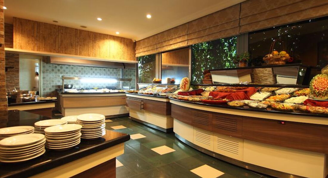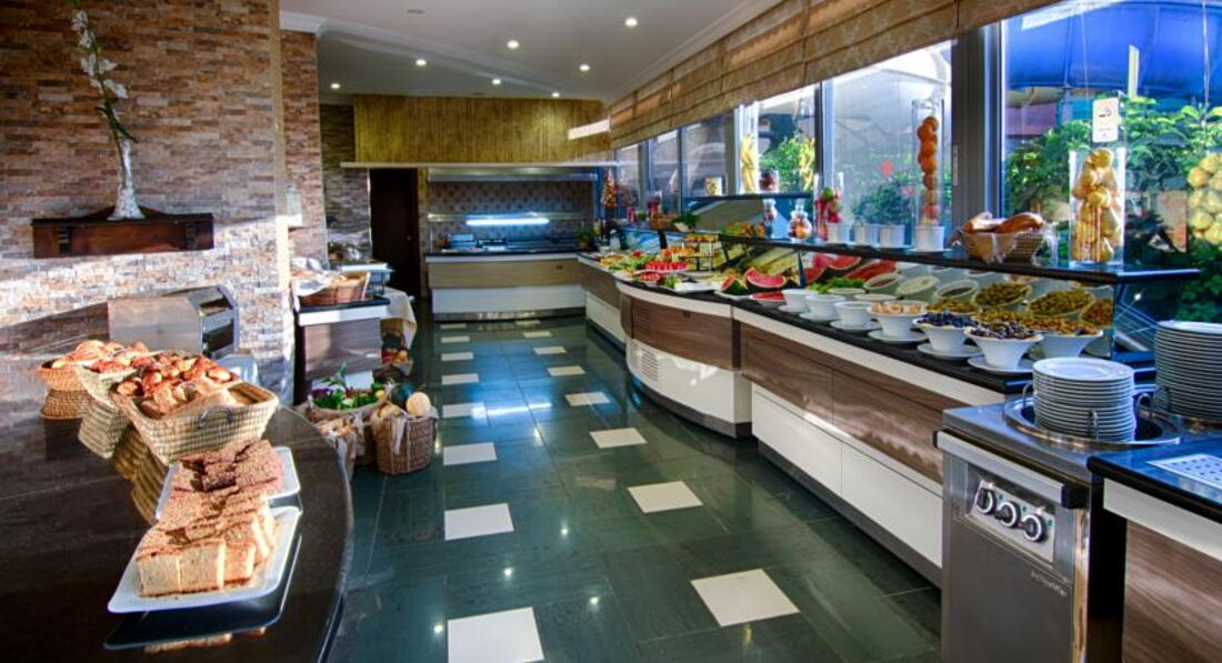 Ресторанчик один, несколько видов закусок, несколько горячих блюд, овощи , фрукты. Не могу сказать , что изобилие, как в некоторых клуб-отелях, но по своему опыту знаю, что это только видимое изобилие, ешь всё равно 1-2 блюда + десерт+ салат. Здесь с этим всё нормально. завтраки стандартные, на ужин всегда новые горячие блюда. Хотелось бы, мне лично, больше рыбы в разных видах. С этим у них были проблемы - в основном, скумбрия и через день. Сына всё устраивало, ему мясо , оно было в разных видах. Кстати, в отеле есть тренажёрный зал, где можно потренировать бесплатно, основные тренажёры работают, и мы с сыном с удовольствием посещали его каждый день.