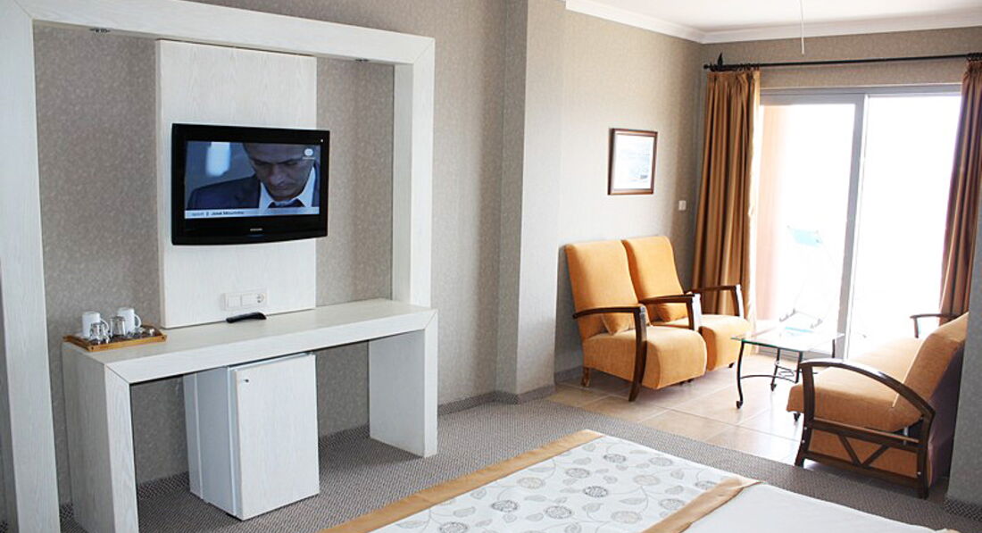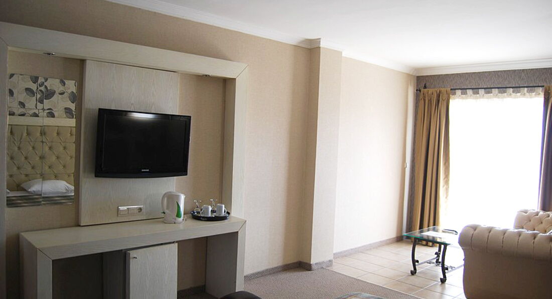 Выбирала отель, конечно, просматривая отзывы. Для нас определяющим стало, что отель расположен рядом с морем и в черте города, поскольку я люблю плавать до завтрака, а сыну нужны были различные развлечения- скутер, водные аттракционы( аквапарк по соседству) и т.д. Прилетели после обеда, заселили в течении 5 минут( номер заказывала с видом на море) всё соответствовало. Единственно, 4 этаж, на нижних этажах менее жарко ( хотя в номере кондиционер работает исправно), да и окна выходят на аквапарк, что меня немного смутило, хотелось тишины и покоя. Но, как выяснилось, аквапарк работает только днём и совсем шума нет, ночью, правда, вода в фонтанах не выключается. Номер довольно просторный , кроме кроватей ещё и диван. Всё чисто , аккуратно, сантехника в норме, уборка каждый день, шампуни, мыло, т. бумага в неограниченном количестве. В мини баре на каждого по бутылке воды, потом либо сам можешь брать в ресторане, либо при уборке, можно заказать у горничной.