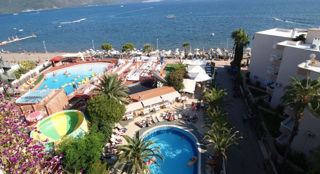 Отдыхали в данном отеле в августе 2013 года)Это было наше Свадебное путешествие с мужем и по-совместительству-первый выезд за границу)Путевку подарили родители на свадьбу)Пишу отзыв,спустя почти 4 года))Так как в скором времени собираемся опять в Турцию,но уже ВТРОЕМ(с доченькой) и не в МАрмарис)В целом остались довольны отдыхом,но нам было скучновато,так как в основном отдыхали немцы,англичане и турки там,русских очень мало и персонал га тот момент совершенно не говорил по-русски)НО!!!!Тем не менее,хочу отметить,что все бармены,официанты очень улыбчивые и доброжелательные))Всегда улыбались и спрашивали как дела и нам с мужем наливали спиртное в стеклянные бркалы,при этом приговаривая 9СПЕШЛ фо Ю)-было приятно очень) )По приезду,нас заселили примерно через пол часа,в ваучере было указано,что мы МОЛОДОЖЕНЫ)Номер дали отличный с видом на море и бассейн)Сам отель маленький,но очень уютный,свои деньги оправдывает)Вай-фай был на территории всего отеля,более того,мне даже кажется на территории всего Мармариса))И на пляже и в барах(бесплатно)Еда в отеле простенькая,перекусы в основном фаст-фуд...рассчитаны явно не на русских...Слева от отеля находится аквапарк,где постоянно гоняли дурацкую музыку(В нашем доме поселился замечательный сосед(Пьеха пела)это просто кошмар конечно)...Анимации практически не было,только в пятницу и субботувечернее шоу(танцы,Майкл Джексон-пародия,арфа и т.д))Пляж и море не понравились,да и в целом сам Мармарис тоже....для меня это тот же КОКтЕБЕЛЬ,только за бешеные(на тот момент)деньги...Понравился сервис и отношение,после побывали в Египте...конечно были ПРИЯТНО удивлены территорией,морем и питанием...ну кому что в общем)Рекомендую для молодежи с большой компанией))