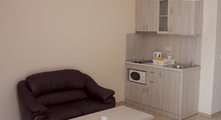 Минусы следующие: 1. Посуды реально минимум - тарелок и кружек (мелких) много. но сковорода одна и кастрюля тоже, крышек к ним нет. тефлон давно износился, лопатка одна и расплавлена кем-то до нас, ни терки, ни чего-то кроме ножей и доски нет вообще. Микроволновка работает плохо. но имеется, греет только еле-еле. Места свободного почти нет. готовить неудобно. И если вы жарите картошку и котлеты, то с учетом одной сковородки - увы. по очереди. Все это не удобно, но впечатления не портит. 2. А вот самый главный минус - это уборка! ЕЕ можно сказать нет. я не придирчива, но вся уборка заключается в том. что она чуть подметает пол посередине комнаты и выносится мусор. Песок остается на балконе (там мы сушили вещи после моря), там же вода из кондиционера постоянно разлита, песок остается под кроватями. В ванной коврик даже не поднимается. чтобы протереть под ним. Если полотенце упало на пол, они подметут вокруг))) Мытья сантехники не производится, зеркала вечно в брызгах как и душевая кабина, посуда уж тем более не моется, и конечно кровати не заправляются. Я просила тряпку. чтобы со стола протирать хоть - но у них их вообще нет!!! только губка для мытья посуды. Полотенце нам не меняли, пока я на 6-ой день не обратилась на ресепшн. Тогда нам поменяли даже постельное белье, но наглая уборщица подложила нам бумагу, где было написано. что если мы хотим от нее что-то сверх положенного, то за все надо платить, например, доп. замена 1 полотенца - 0,5 лева! На ресепшн сказали, что все меняется каждые три дня. в реалии полтенца поменяли один раз, даже когда бросали на пол или у дверей, к ним никто не прикасался. Постель сменили два раза. В итоге пол я вытирала сама купленной тряпкой! Ревизорро на них не хватает однозначно.