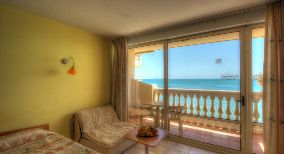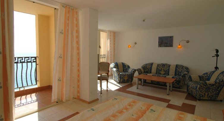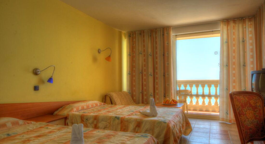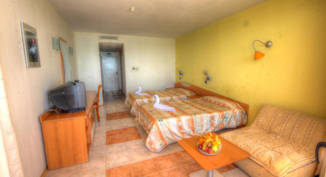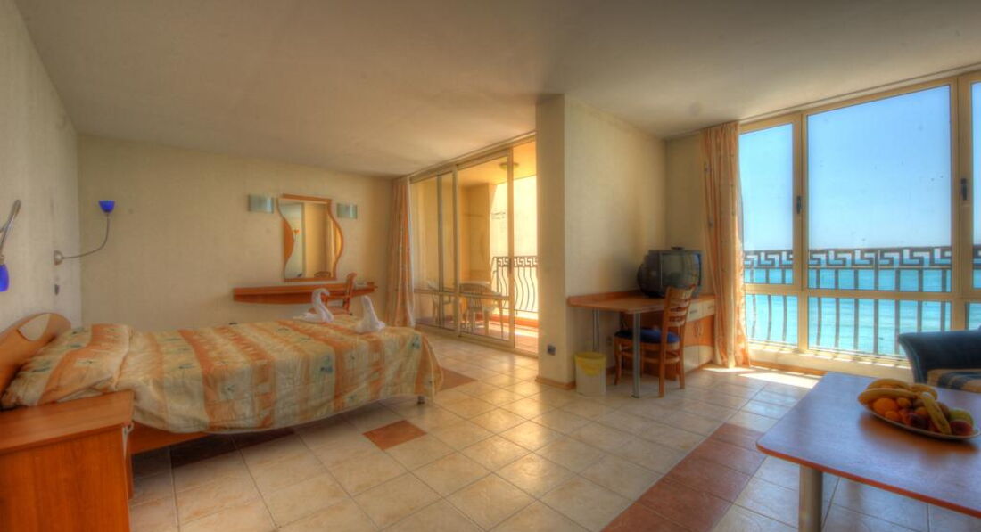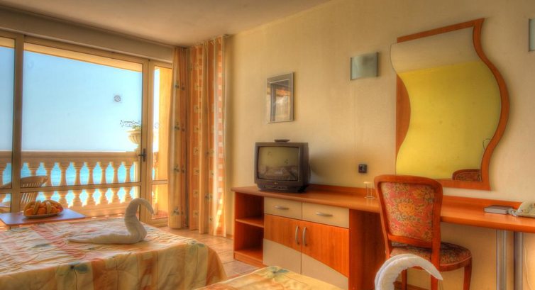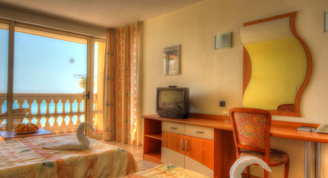 5 этаж – шикарный вид на море и ласкающий ухо шум прибоя. В номере 2 кровати и дополнительное место (маленький диванчик), но почему-то нам его не заправили постельным бельём. Пришлось сдвинуть кровати, чтобы положить ребёнка с нами спать. На утро мы уладили этот вопрос без проблем. Очень приятная горничная на ломанном русском извинилась и местечко для дочки было готово. Кондиционер, сантехника, свет, вентиляция – всё работает. Телик обычный кубик (нашли 6 русских каналов, один из них, на радость дочери - «Бумеранг» - с бесконечными мультяшками). Сейф в номере платный – 7 левов в сутки. Причём услуга доступна при оплате сейфа на весь срок пребывания.