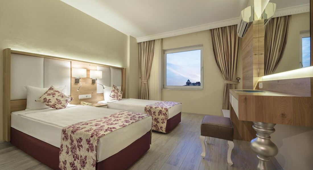 В Турцию прилетели днем, но пока групповой трансфер с заездами во все отели до своего добрались к вечеру. Заселение прошло быстро и без проблем, только нам досталось две кровати, свободных номеров с одной не оказалось, максимум что они смогли сделать это их сдвинуть. Уже позже оказалось, что у отеля два корпуса, один тянет на пятерку и по меньше, другой большой и это максимум четверка. В путевке у нас была заявлена пятерка, но как оказалось всех русских по умолчанию селят в большой корпус. Узнали мы это все уже под конец от других туристов, а до этого все удивлялись бедностью отеля для заявленных пяти звезд. В общем какое-то надувательство.