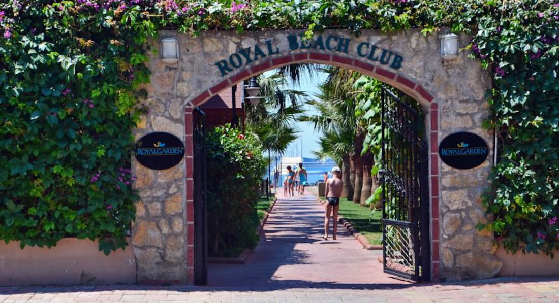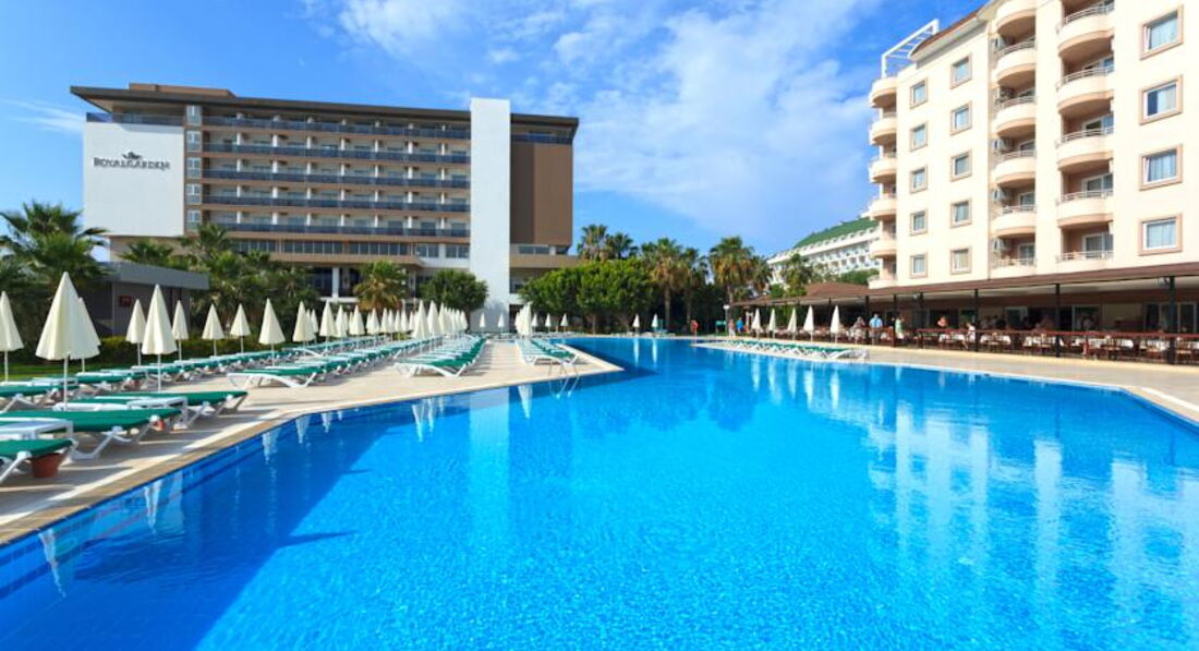 Отдыхали в отеле с 16 июня по 26 июня 2017 года с семьей(муж и две маленькие дочки). Приехали в отель в 10 утра и были очень приятно удивлены тем, что нас сразу же заселили. (в 10.15 мы были уже в своем номере). На ресепшене нас встретила приветливая и улыбчивая рускоговорящая девушка Оксана( молдованка, которая прекрасно разговаривает по русски), все нам рассказала, объяснила.Далее нас проводили до номера(чемодан нам нес сотрудник отеля). Номер был 2-комнатный.Все чисто и аккуратно.В номере кондиционер в каждой комнате, холодильник, телевизор. Есть сейф, но его аренда стоит 3 доллара в день.Так как нас было 4 человека, у нас была в одной комнате двухспальная кровать, во второй-2 одинарных. С видом из номера нам также повезло. Справа нам был виден городок и мечеть, которая вечером была очень красиво подсвечена, слева было видно море.Территория отеля большая, чистая и очень красивая. Садовник внимательно следит за состоянием растительности. Много пальм, красивые цветущие кустарники, оливковые деревья,кактусы, большуханские юкки. Очень-очень красиво. На территории отеля расположено 7 бассейнов. 1-взрослый с дорожками, 2-глубокий для взрослых, 3- для детей без горок,4-детский с горками(глубина 40 см)очень удобен для малышей, 5-детский с грибочком посередине, с которого стекает вода, а также с 2 небольшими горочками, 6- с горками для взрослых, 7- также с горками для взрослых, но покруче. Возле всех бассейнов множество лежаков(место хватало всегда и всем).Возле бассейнов с горками постоянно дежурил сотрудник-спасатель. урны чистили постоянно, мусора нет совсем.На территории отеля расположено 3 бара. на протяжении всего дня можно было пить соки, кофе, чай, пиво, коктейли, вино, водку..... В Blue-баре работает потрясающий и улыбчивый бармен Архан.В 11 часов утра в баре на пляже пекли совершенно потрясающие лепешки( в приготовлении даже повезло однажды поучаствовать). в 16 часов в блю-баре пекли пончики и угощали различной вкусной выпечкой. На завтрак, обед и ужин кормили очень сытно, разнообразно и вкусно. Есть как турецкая, так и европейская кухни. Повара старались и удивляли нас своими кулинарными способностями. Каждое блюдо было оформлено очень красиво. Очень хочется отметить официанта Фати.Классный, веселый и очень общительный.Анимация в отеле-есть миниклуб , который работает с 10 до 12 утра, а также с 3 до 5 вечера. В 8 часов вечера проходили детские дискотеки, а в 9 часов вечера проходили различные шоу. Администрация отеля постоянно приглашала артистов для развлечения туристов( были световые, огненные, акробатические шоу). У отеля вторая береговая линия, но этого даже не заметно, т.к. дорожку, которая ведет на море пересекает дорога, я бы ее сравнила с дворовой дорогой, по которой очень редко проезжали машины. Далее переходя через эту дорогу, ты опять же попадаешь на территорию этого же отеля с волейбольной, детской площадками, 2-мя барами и лежаками с зонтами( Т. е. другого отеля перед Рояль Гарденом у моря нет, ничто не заслоняет вида на море и не мешает прохода к нему).