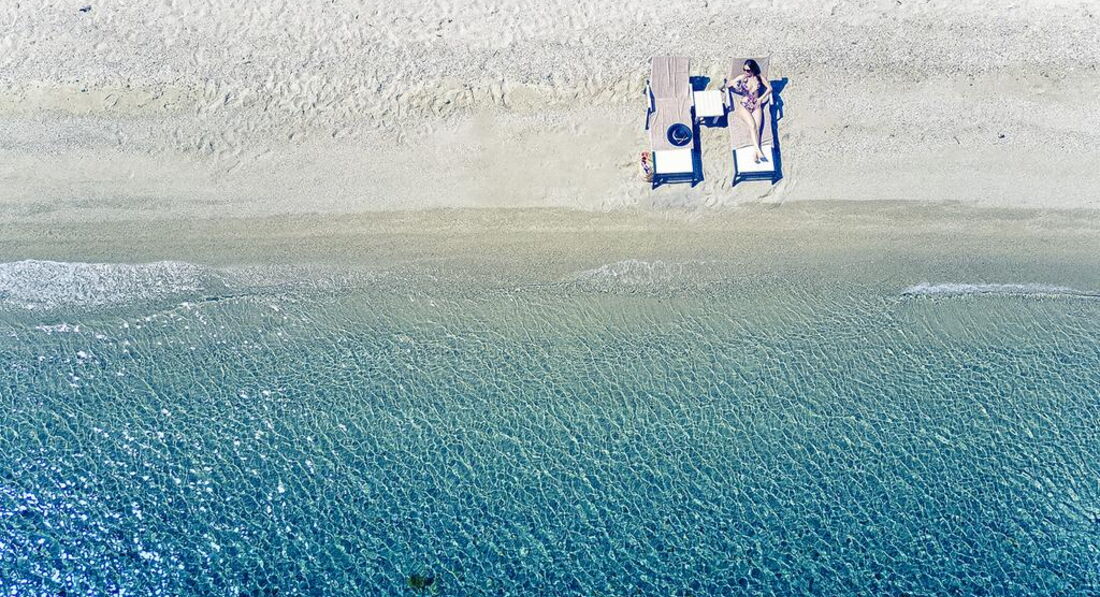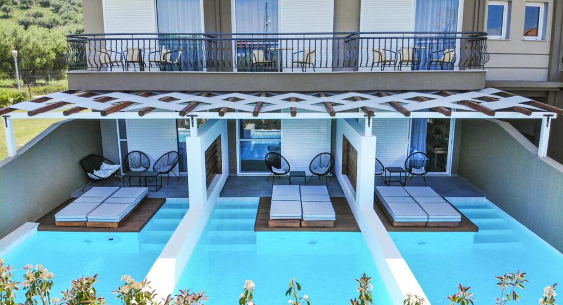 • два відкритих басейни з шезлонгами та парасольками навколо них