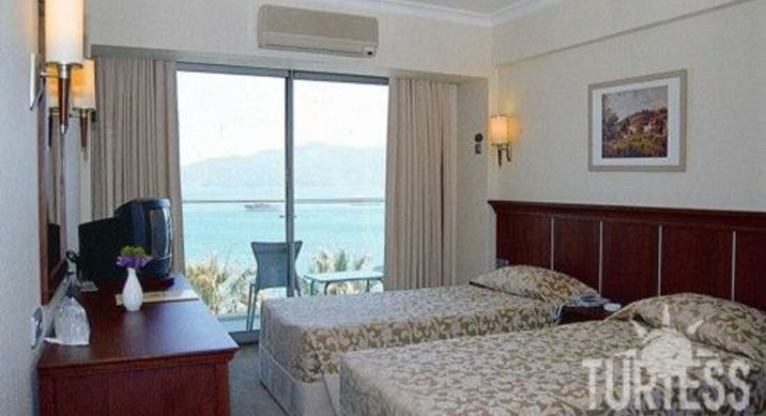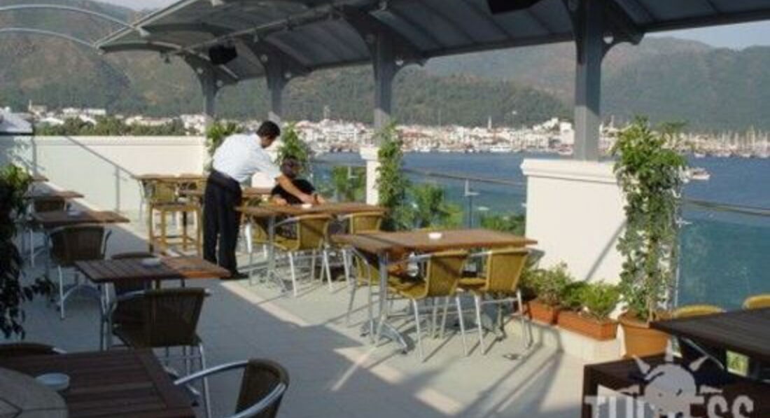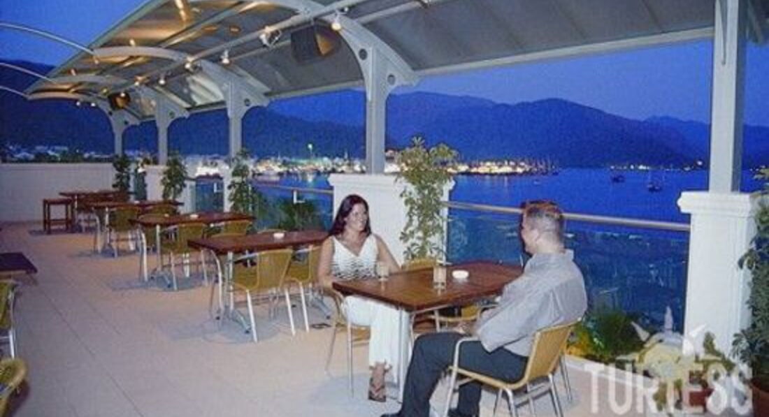 Самый подробный и главное очень правдивый отзыв - это отзыв г-на Vladimirovа.Очень все подробно описал, и главное правильно подметил, вежливость и знание английского языка (даже небольшое) решают все проблемы. МЫ с подружкой тоже отдыхали в этом отеле в 2008г. ,ничего особенного от него не ждали, в Мармарисе до этого уже были в 2004г., но в другом отеле.Да, может на 4 звезды он и не тянет, но это центр города, и поэтому на лучшее там рассчитывать и не стоит, трёшки там еще хуже, а если хочется лучше, то нужно выбирать 4-5 звезд на окраине Мармариса, или в ИЧМЕЛЕРЕ, так там отели уже намного больше по территории и набору услуг и системой все включено. Или вообще ехать в Кемер, Анталью и т.д. А для центра Мармариса оч. даже хороший отель, если бы еще в нем не было номеров с видом на стену, да еда была хоть просто на выбор, цены б ему не было. МЫ были в конце мая, и видимо из-за того , что отель был не весь заполнен, шведского стола вечером не было, т.е. официант просто приносил то, что есть (салат, суп и горячее), т.е. не хочешь не ешь. Вот это несколько нам не понравилось. Все же когда есть выбор, пусть и небольшой, это намного лучше. А так, отель очень чистый и добротный. Персонал тоже обычный, улыбчивый, и главное понимающий, что говоришь, то и делают.Кстати,там работала турецкая девушка Демет, она нам рассказала, что русские очень высокомерные, не вежливые, обзываются.Она хоть по русски кроме спасибо ничего и не знает, но зато русский мат уже выучила.Проблем нет, ни с водой, ни с кондиционером,ни с проносом продуктов и напитков. Кстати, про плохую звукоизоляцию в каком то отзыве тоже верно подмечено,нам пару раз с ресепшена звонили, просили вести себя потише. Там действительно все оч. хорошо слышно, особенно в туалете :))))))) Но как мы подметили, жалуются в основном на русских немецкие и англ. бабульки и дедульки,которые тебе всегда улыбаются, но чуть что сразу звонят на ресепшен. Они в отличие от нас молодых, спать по ночам хотят, а не по дискотекам и ресторанам гулять. Сами мы ни на кого не ябедничали,у нас то немцы за стенкой ругались днем и ночью, то другие рус. девчонки хихикали. В общем,всем кому хочется так же как и нам жить в центре Мармариса, WELCOME.