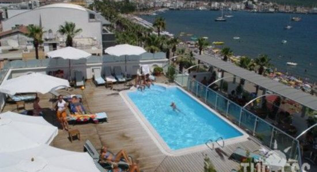 Отдыхали мы с 27 августа по 8 сентября 2008 года!Когда выбирали отель,руководствовались в основном хорошим расположением!Расположение действительно идеальное для тех,кто едет в Мармарис тусоваться,а не сидеть в номере!Расположение-10 мин от bar street!Территории отель не имеет,но нам она и не была нужна!ПЛЯЖ НАХОДИТСЯ ОЧЕНЬ БЛИЗКО(МЫ ОЖИДАЛИ ДАЛЬШЕ)!На пляже все зонтики,шезлонги и матрасы на шезлонги-бесплатно!Это тоже большой "+"!Нам не понравился персонал отеля!Очень наглые турки!Например,сауна должна работать с 11 утра и до 7 вечера!Мы приходим туда(там работает Фикрэ),а он нам неделю подряд говорит :"Она не работает до 15:00"!Мы сначала ждали ,а потом не выдержали и пошли на reception разбираться с этим!Короче,оказалось,что естественно она и не думала ломаться,а просто этот турок был такой вредный и ленивый,что не хотел её включать!Так после того,как мы пошли разбираться,этот Фикрэ на нас так наорал(в прямом смысле этого слова)....было такое впечатление,что ещё чуть -чуть и вообще ударит!мы были в шоке...правда потом всё-таки извинился...и вообще ещё пробовал деньги с нас брать за сауну,джакузи,которые в отеле предоставляются бесплатно!А beachman(его зовут Однан)(человек,который должен следить за порядком на пляже,доставать матрасы,открывать зонтики) вообще любит привязаться к отдыхающим,очень не любит людей,которые у него ничего не покупают(соки,картошку и т.д.)Ещё пытался пару раз закрыть пляж раньше(т.е. забрать матрасы раньше на час)(вообще их забирают в 7 вчера) и объяснял это тем,что он идёт ночью в клуб,он устал и хочет выспаться!Это нас поразило!Пляж грязноватый,но море чистое!А вообще сам отель очень хороший!Мальнький,но очень уютный!Бассейн на крыше-супер!Ещё нам очень повезло с номером!Если вам дают пятый этаж(т..е. номера501 и тд.)-берите с закрытыми глазами!Это лучшие номера!А на остальных этажах есть номера с выходом на стену!Стена-это конечно ужасно!Она расположена в 2 метрах от окна!При чём даже ничего не видно,что творится на улице!Номер,впринципе,всегда можно поменять,т.е. за отдельную плату(60 $).Всех русских обычно селят с видом на стену,нам,видимо,просто повезло!Номера сами очень хорошие !В номере всё новое!И сантехника и мебель,т.е. всё!Убирают каждый день,но если чаевые оставлять,то убирают намного лучше!Кстати,сауна хорошая,но разогревают её мало(надо просить,чтобы посильнее).Джакузи простенькое,но работает)Тренажёрный зал-2 тренажёра,но хорошие))За отдельную плату есть хамам,но дорого(впринципе,можно с ним сторговаться).Одна женщина вообще сторговалась за 7 лир)))Еда в отеле можно сказать нормально...Но завтраки очень однообразные,за 12 дней,кроме супа-пюре ничего не менялось...это надоело...говорят,что хозяин жадный и на еде экономит...Зато ужины нам ооооочень нравились!Там всегда было что-то новое!И очень вкусно было!Официантки очень приветливые!Короче,цена соответствует полностью качеству!!!Нас отель приятно удивил!!!Я бы снова вернулась туда в след году!!!Всем ,кто отдыхал в то же время огромный привет!