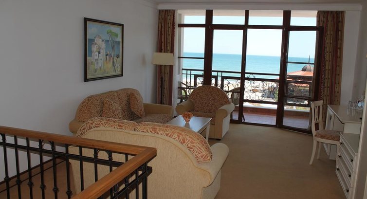 Отель понравился настолько, что мы уже планируем повторить поездку туда в следующем году. Кстати, ездили с 6-летним ребенком. Красивое здание, просторный номер с видом на море, по всему зданию настоящие картины (не репродукции и не дешевые фото) современных болгарских художников, в номере тоже картина. На территории отеля много статуй прикольных. Питание на 5 с плюсом - на завтрак шампанское и клубника, каждое блюдо на ужин ресторанного качества - бери любое, не ошибешься. Шеф-повар - молодец! Прекрасный СПА-центр - красиво, уютно, приятные руки у косметологов.