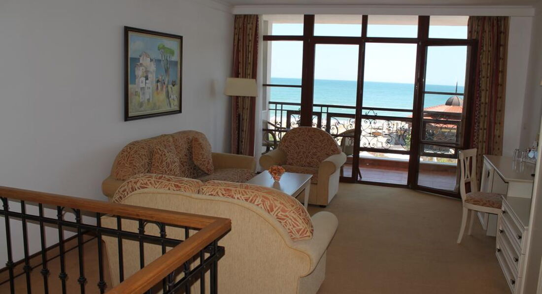 Отдыхали в августе-сентябре 2016 семьей: мама, папа и трое детей (шесть лет, четыре года и шесть месяцев). Из аэропорта добрались достаточно быстро. Встретил улыбчивый главный менеджер, заселили очень оперативно. Номер мы забронировали двухуровневый: очень просторный, удобный, на каждом уровне балкон с чудесным видом на бассейн и море. Первый раз отдыхали в Болгарии. Сразу же напишу, что если бы гостиница была бы крепкой тройкой или четверкой, то претензий к ней бы не было. Но на пять звезд она однозначно не тянет по очень многим параметрам. Итак, плюсы: