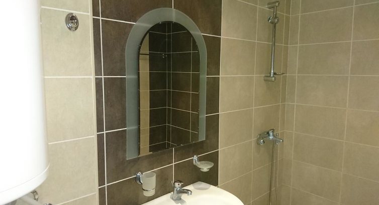 санузел совмещён,душ хороший,но без поддона,с дыркой в полу,мне даже понравилась такая система,вода горячая постоянно(кстате следите,чтоб кнопка красная на болере и вторая в комнате около выключателя всегда горела,а то у меня доча выключила в комнате,воды горячей не было,отельский мастерок всё "починил" по первому требованию)