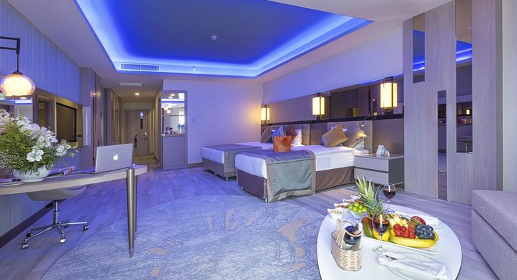 Начну с плюсов:интернет есть в лобби в номере,и у бассейнов,что безусловно радует.Много персонала разговаривает на русском языке,в том числе и анимация,бармены,официанты,рецепшн,гастрелейшн.Безумно доброжелательные девочки аниматоры из мини клуба,относятся к деткам как к своим,что не может не радовать.Большие стандартные номера,даже на 4 места предостаточно.Парилка в номере класс!На день матери аниматоры дарили мамам розы!При заезде в номере корзина с фруктами и бутылка вина!Атракционы и Аквапарк понравились,хотя на некоторых горках плохие швы.