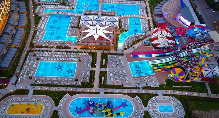 Бассейны хорошие вода чистая,вечером красивая подсветка,территория никакая,кроме бассейнов,аквапарка и атракционов ничего нет.Зелени сейчас нет,ну это логично) Что бы сдать или взять пляжные полотенца надо не попасть в обед а то будите стоять час в ожидании вместо того чтобы наслаждаться отдыхом.