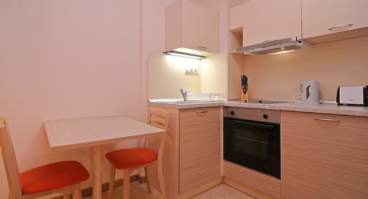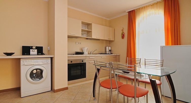 НОМЕР. Жили в корпусе i на третьем этаже. Комната 1 (i31). Есть лифт, правда он довольно медленный. По лестнице спускались быстрее. Номер с кухней и балконом чистый, уютный, но отдает немного стариной. Есть кондиционер телевизор с небольшим количеством каналов в основном на болгарском и турецком языках. Из русских каналов были Первый, НТВ, ТВЦ, Planeta, Охота и Рыбалка. Кухня обустроена электрической плитой, есть духовка. В шкафчиках можно найти все необходимое: ложки, вилки, ножи, половник, открывалка для вина, тарелки, суповницы, доска для резки, бокалы, стаканы, рюмки, солонки, кастрюля, сковорода. У сковороды не было крышки. У нас стояла кофеварка, мы попросили поменять на обычный чайник. Принесли на следующий день. У раковины стояло средство для мытья посуды с губкой.