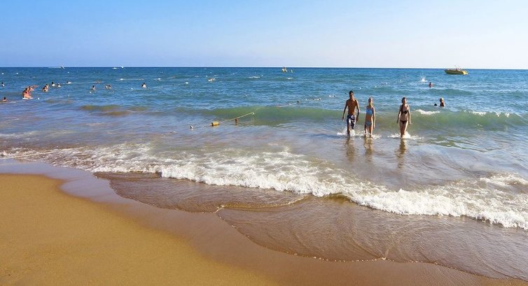 Пляж широкий, лежаков достаточно, они расположены под длинными тентами, что очень удобно. Море теплое, но не очень чистое. Видели и плавающие стаканчики, и какие-то обертки, и даже памперсы. Иногда море было чистое, возможно, зависит от течения. Заход плавный, подходит для малышей.