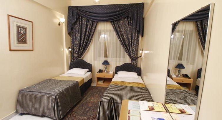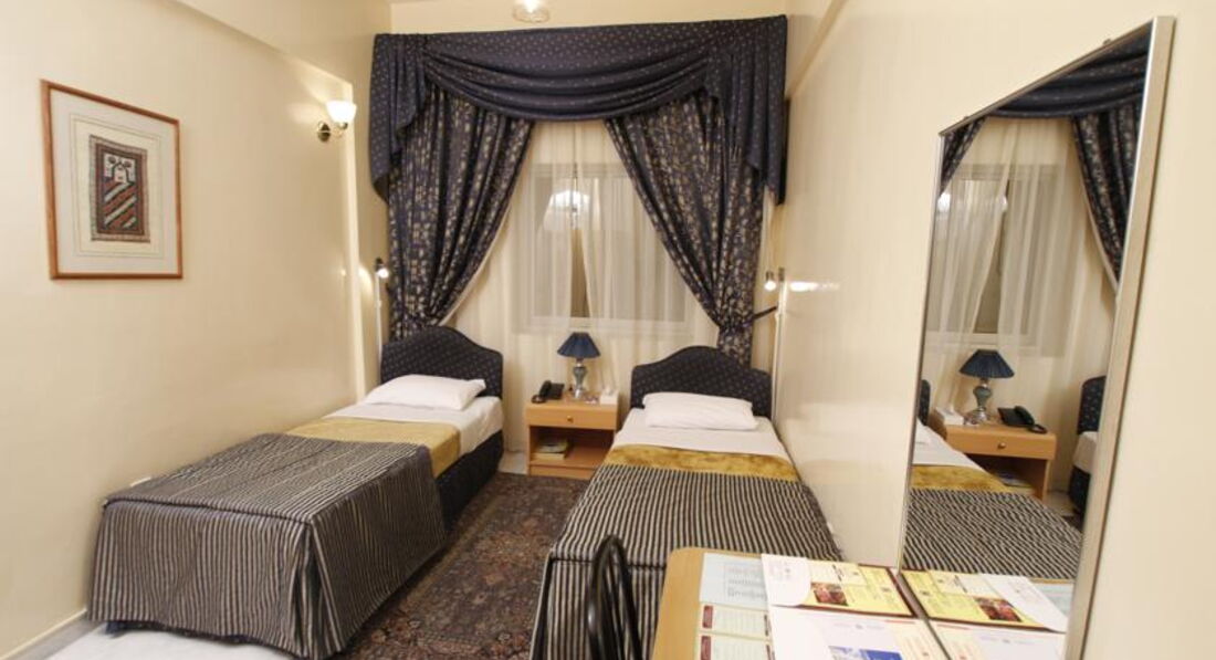Отель конечно скромненький. Но в номере было чисто; есть фен, шампунь, мыло, сухие салфетки, два стакана и кувшин для воды без воды (соседка говорила, что ей без просьбы приносили и воду, и чай), холодильник, LCD телевизор. Комната с двумя отдельными кроватями маленькая, где двуспальная - номера побольше.
