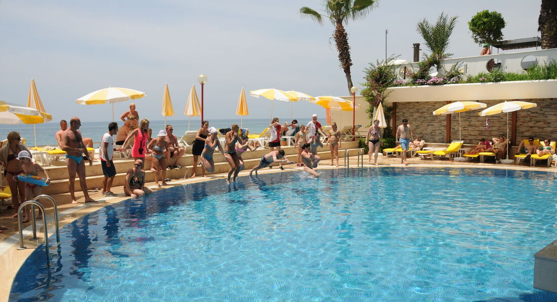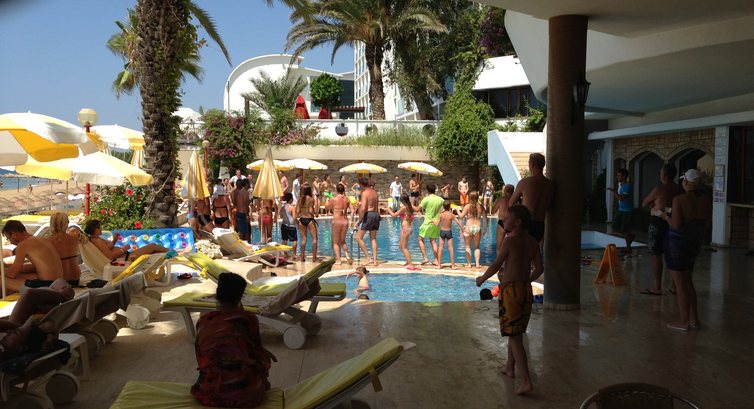 Начну с минусов: территории вообще нет, но это не напрягает. Побывав 17 раз в Турции в разных отелях, скажу. что такого бассейна ни разу не видела: лягушатник, естественно горок нет. Персонал: навязчив со своими приглашениями, хотя поводу к этому нет. Анимация: полный отстой - для трещки было бы нормально. Очень скучно, никакого зажигания.