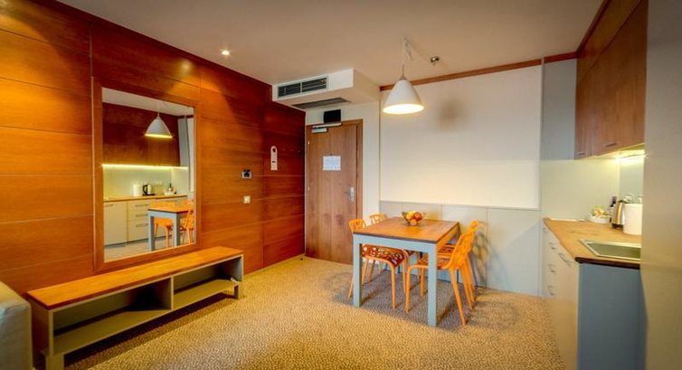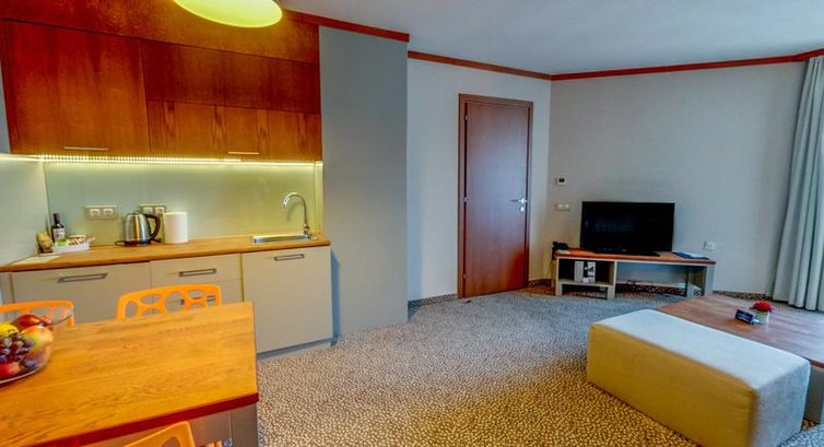 • Apartament Junior – спальня з двоспальним ліжком або двома односпальними ліжками, вітальня з диваном та кухонним куточком (електрочайник, посуд та столові прилади), є міжкімнатні двері, макс. 2 дор.+1 дит., 60 м2