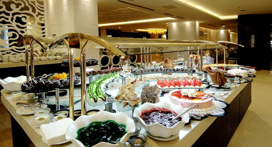 Сервис в отеле на хорошем уровне, уборка ежедневная, в мини баре вода и соки пополнялись каждый день. Питание - отдельная песня: такого обилия и разнообразия блюд, и мясных в том числе, я в Турции не встречала( может конечно не в тех отелях была) , но всегда на ужин баранина, курица, говядина ( причем в разных видах), язык, рыба - тунец, речная форель. Фруктов было много, арбузы каждый день не только на ужин но и на завтрак и обед, клубника, и много еще, перечислять не буду. Удивило отсутствие очередей в ресторане, только на ужине достаточно много народу, иногда надо поискать пустой столик, на завтраке и обеде вообще без проблем. За ужином официанты разносят напитки.