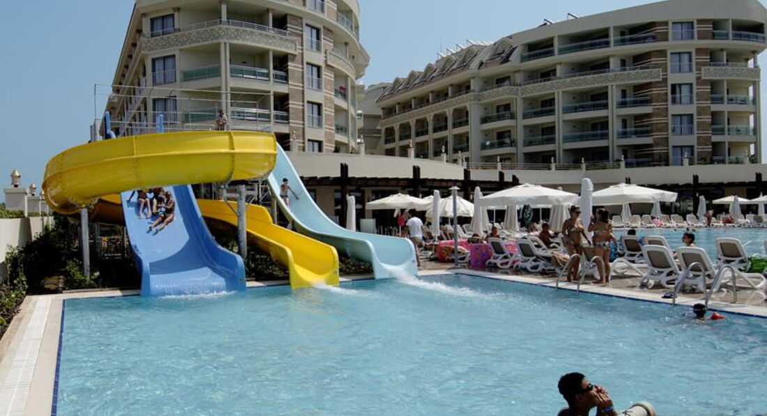 Касаемо самого отеля...по приезду (около 8 утра) как обычно ставишь чемоданы, заполняешь карточку, одевают браслеты и вперед, изучать территорию. В лобби всегда приятная атмосфера...прохладненько и спокойно, нет суеты))) спустившись на один этаж : пойдешь налево попадешь в главный ресторан, пойдешь направо попадешь в Хамам ( там же выдают-меняют полотенца), прямо пойдешь в шопинг-центр попадешь))) несколько небольших магазинчиков где продают все начиная жвачкой и заканчивая шубой))) Здесь же выход на улицу к бассейну. Бассейн удобный можно не только по лесенкам металлическим спускаться, но и по ступенькам что удобно для деток которые не умеют плавать, глубина 145 см. Горки в отдельном бассейне (глубина 115) , три штуки "семейная" "крученая" "отвесная". Катаются ВСЕ!!! от мало до велика детки в нарукавниках и в кругах и в масках, наверху следящий за ситуацией который контролирует спуски))) На выходе на променад есть бассейн для малявочек...по дороге на море в баре холодильники с водой...бар с напитками и едой ( с 12 до 16)..мы часто обедали именно там. На выбор предлагаются блюда типа пицца, гамбургеры( чикенбургеры и т.п.) шаверма с гарниром...паста в разными соусами....делаешь заказ и тебе приносят))) на островке овощи фрукты лепешка))) море....море...лежаков всегда достаточно, матрасы в нормальном состоянии...между лежаками и морем достаточно места для того чтобы "загаральщики" построили еще несколько рядов шезлонгов, никто не возражает. Единственное между пляжами разных отелей границы практически нет....мы всегда ложились на границы и к вечеру лежаки "перепутывались" но никто не ругался все были спокойны и приветливы.