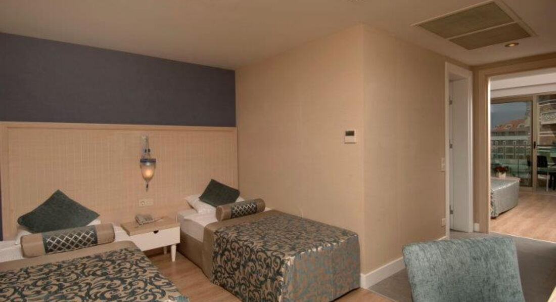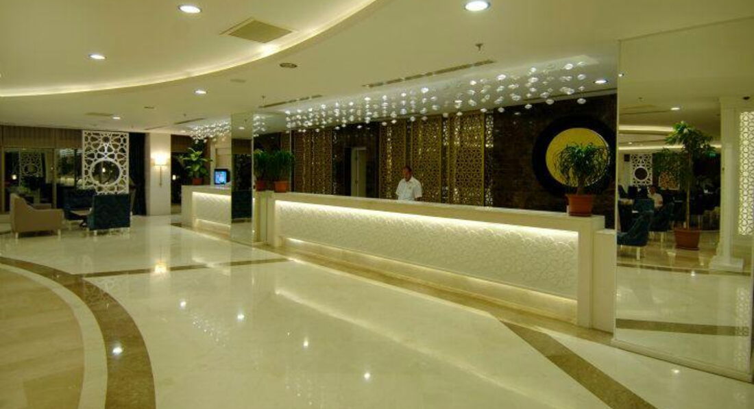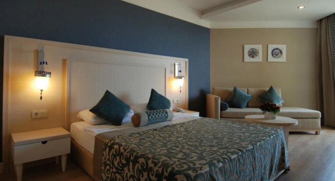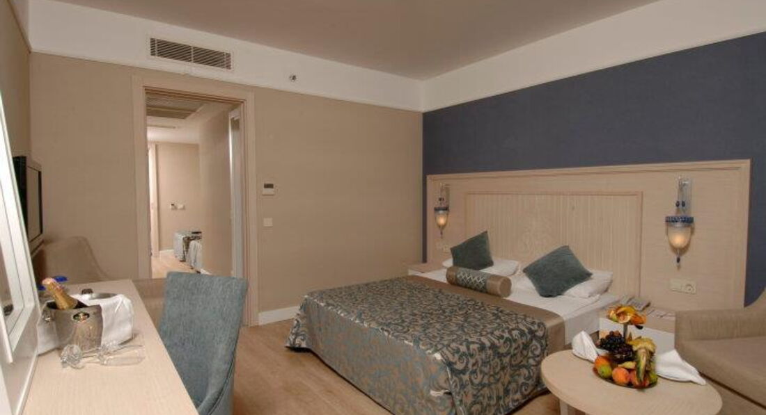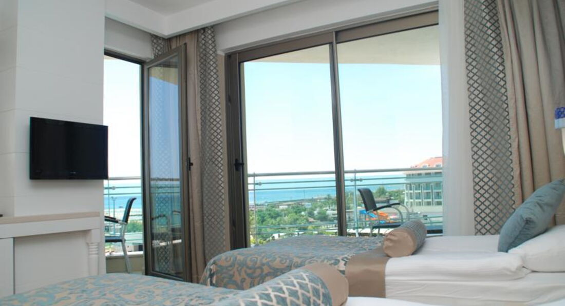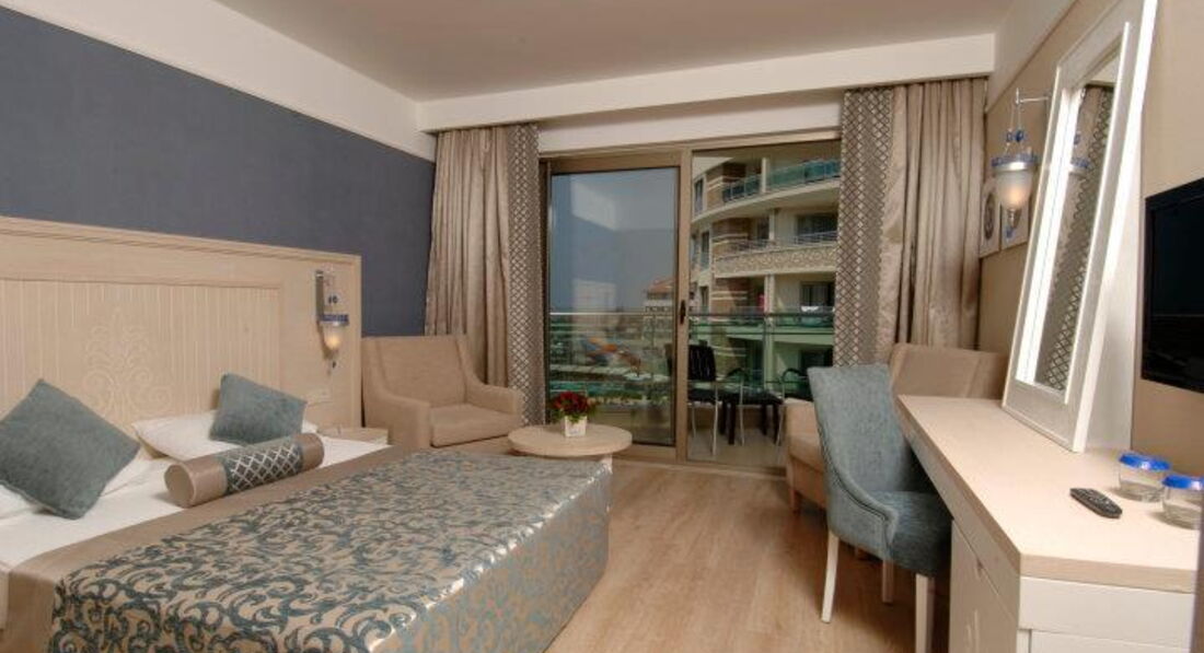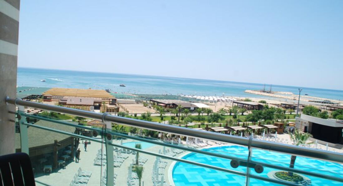 Отдыхали в отеле с 31.05.17 г. по 07.06.17г. Начну по - порядку: летели из Екатеринбурга а/к azur air, вылетели без задержек, четко по расписанию. Приземлились в Анталье около 6.00 на таможне было очень много народу, даже ооочень много! Управились минут за 40. А вот багаж ждали 2 часа! Около 8.30 вышли к автобусу Anex, нас уже ждали. Путь до Сиде занял около 1 часа 40 минут. В начале одиннадцатого были в отеле (наш отель был третьим, развезли нас оперативненько). Трансферный гид проводил до ресепшн, заполнили карточки, он пожелал нам хорошего отдыха и поехал дальше (его присутствие было кстати, т.к. по- русски администратор не разговаривал) Сказали что номер ещё не готов надели браслетики и отправили в ресторан завтракать. Позавтракали, немного погуляли, пол- двенадцатого зашли на ресепшн и нам помаячили, что можно заселяться. ( отель "заточен" под немцев, по- русски не разговаривает никто! Но трудностей в общении не возникало, люди стараются) Вручили пакетик с электронным ключом и двумя карточками на полотенца, и, в сопровождении носильщика мы отправились в номер. Он довез вещи до номера, показал как включить- выключить кондиционер, телевизор, показал каналы на русском языке и удалился. Номер порадовал: чистый, мебель добротная, стекла на окнах в пол, плотные светонепроницаемые шторы. Звукоизоляция хорошая. Когда закрываешь балконную дверь, что творится на улице не слышно вообще. Мини - бар в холодилнике под телевизором (вода, минеральная вода, сок-пополняли ежедневно). В номере большая двухспальная кровать, две тумбочки столик, кресло. В прихожей большой шкаф-купе. Сейф в номере платно.