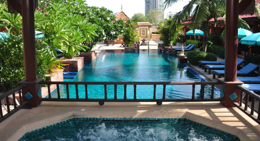 Всем доброго времени суток!Отдыхали в данном отеле в августе 2015 года, две семьи с детьми 3 лет.Перед поездкой долго и тщательно выбирали отель, т.к. планировали отдых с маленькими детьми, обязательным требованием было наличие бассейна с детской секцией , номера типа вилл и хорошая немаленькая территория отеля,чтобы дети беспрепятственно могли носится где пожелается и в тоже время оставались на виду...а так же хотелось недалеко от центра. Отель находится в центре Паттайи, прям через стенку от Альказара...но никакого шума или дискомфорта это не вызывало.По приезду, а мы приехали в районе 11 утра, нас сразу же расселили без всяких проволочек, номера мы бронировали в зоне вилл, это двух-этажные строения и у каждого номера свой выход и своя терраса.Нам с друзьями достались соседние номера , в номерах между нами межкомнатная дверь, поэтому наши сорванцы так и ходили к друг другу в гости все время нахождения в отеле и будили друг друга и нас по утрам.Номера очень большие, есть все необходимое и даже больше...мебель не очень новая, но вполне в хорошем состоянии, сантехника новая. Уборка производилась ежедневно, претензий не было...на территории три бассейна,но мы купались в том ,который был ближе к нам, там и детская секция есть и джакузи можно включить по желанию и мест всегда было полно свободных.Но в основном мы конечно ездили на Ко Лан, а здесь охлаждались по приезду. По поводу кухни нас тоже все устраивало, питание достаточно разнообразное, каждый находил для себя что-нибудь, одним словом голодным никто не оставался.Если представится возможность еще раз отдохнуть в этом отеле, то с удовольствием!!!