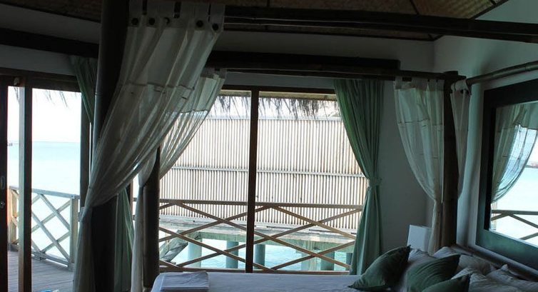 Мы жили в полуводном бунгало. Заход с песка по мостика, само бунгало над водой. В номере есть стеклянный столик - окошко с подсветкой. Можно смотреть как плавают рыбки. Все бунгало шикарные. Окно полукруглой, вид на океан вокруг тебя просто сумашедший. Все в дереве. Номера очень красивые и современные . Есть своя терраса с лежаками и сход в воду. Мы иногда там плавали над рифом возле номера. Очень удобно. Когда отлив, воды там маловато. Пару раз к бунгало во время прилива заплыли большие акулы, а начался отлив, уплыть не успели. Плавали по мелководью как угорелые, мы наблюдали за ними с террасы. С террасы можно сразу пройти в санузел, сразу принять душ. При входе кран для отмывания ног от песка. Т.к туда можно зайти и с мостика, если гулял босиком по отелю.