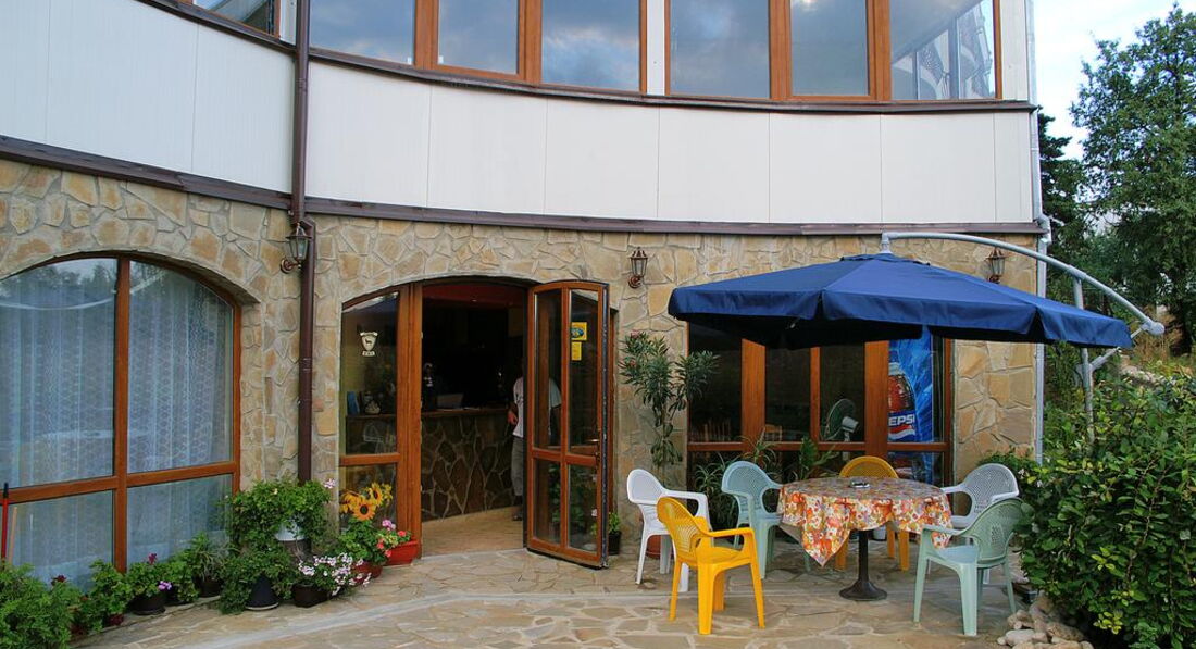 Вид очень красивый. Курорт действительно очень зеленый. Расстроило, конечно, убожество и запущенность самого кафе и отеля, а также неприятный запах, преследовавший нас в пределах этого здания. Даже если бы у меня была, там хорошая комната не хотелось бы там жить. Не пойму, почему мне советовали этот отель как один из недорогих и неплохих трешек. Даже с виду он с «Глорией» в сравнение не идет.