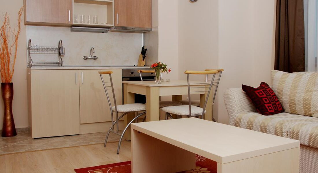 One Bedroom Аpartment – в апартаментній будівлі, спальня з двоспальним ліжком та вітальня з розкладним диваном та обладнаним кухонним блоком (плита, холодильник, електрочайник, посуд та столові прилади, міні-холодильник), обідній стіл, міжкімнатні двері, макс. 2 дор. + 2 дит. або 3 дор., 49 -50 м2;