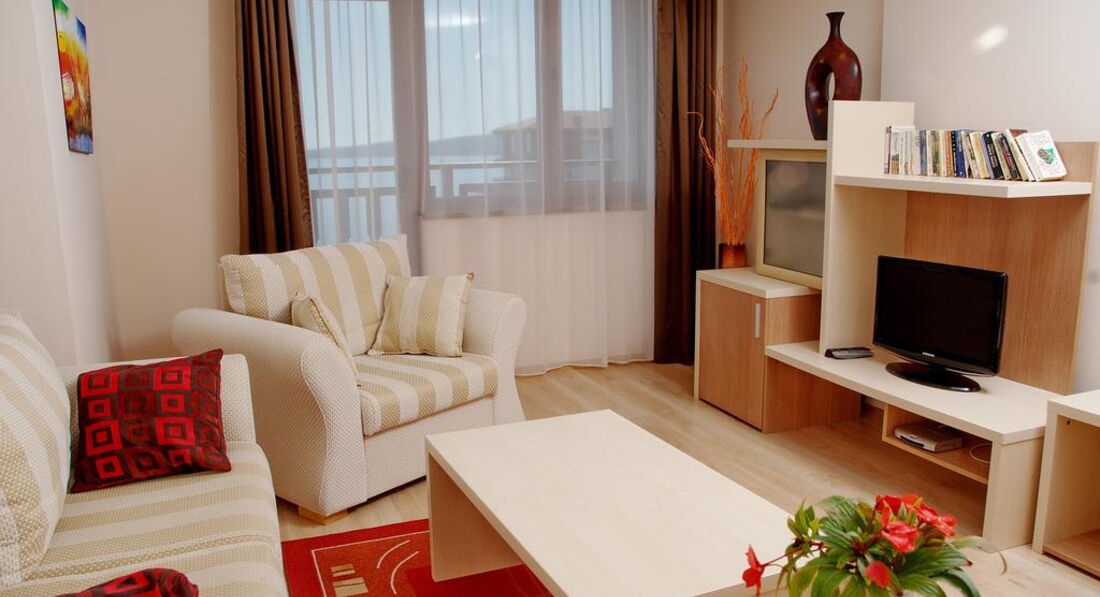 1 Two Bedroom Аpartment – в апартаментній будівлі, 2 спальні з двоспальним ліжком у кожній та вітальня з розкладним диваном та обладнаним кухонним блоком (плита, холодильник, електрочайник, посуд та столові прилади, міні-холодильник), обідній стіл, міжкімнатні двері. 4 дор. + 1 дит., 75 м2.