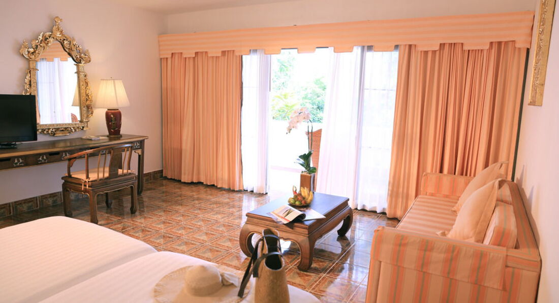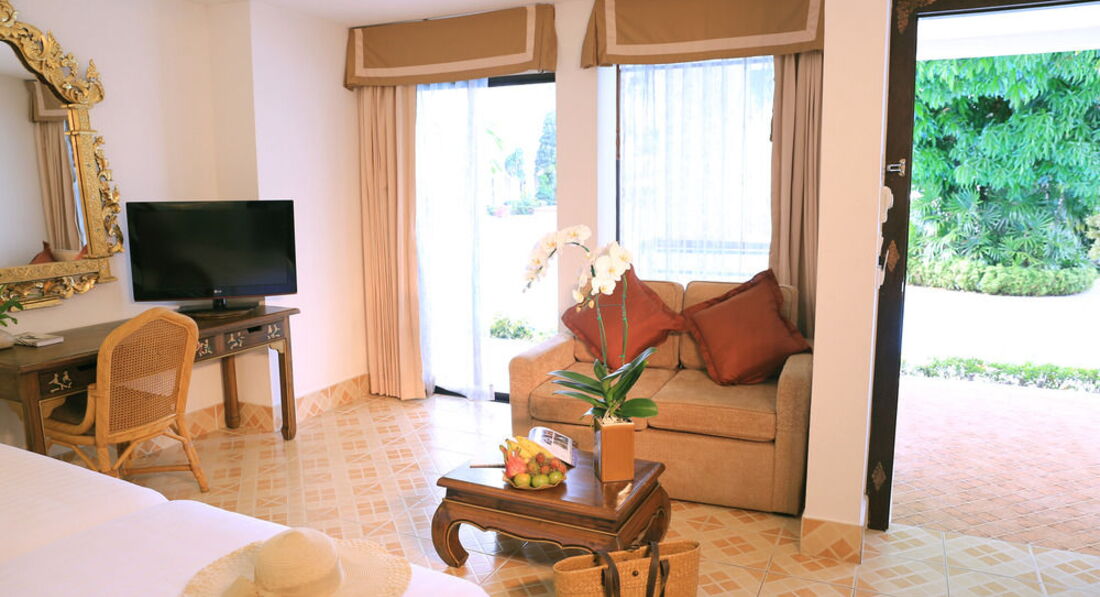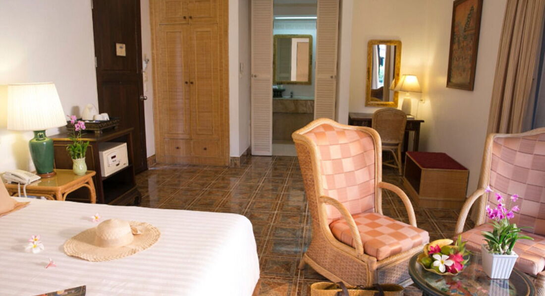 Отдыхали в феврале в этом отеле. Отель понравился, тихий, спокойный, детей мало, в основном иностранцы. Территория зеленая, очень ухоженная. Красивые бассейны. Отель большой, есть двухэтажные корпуса и бунгало, старенькие конечно, но все сносно.. Мы брали де люкс в основном корпусе. Номер большой, но были некоторые НО... Отдыхали с сыном (21 год), дали номер с одной кроватью, чайник в номере не работал, балкон не открывался. Обратились на ресепшн (русскоговорящего персонала нет) , прошло 2 дня, но ничего не изменилось. Обратились к своему тур. оператору Библио Глобус (Даше), она порешала вопрос, дали другой номер, но опять же с одной кроватью, но балкон и чайник работал...) Сервис намного ниже, чем в отеле Бандара, где мы отдыхали не так давно... Нет тапок (а пол плитка-холодный), нет халатов.. В Бандаре все это было+весы напольные и сумка пляжная. Питание хорошее, все очень вкусно, выбор конечно не , как в Турции, но голодными не будите. В ресторане обслуживают только иностранцев, русских игнорируют. Приходилось самим ходить и наливать кофе и чай, тарелки тоже не спешили убирать. Пляж хороший, море спокойное было, хотя на Чавенге все жаловались, что зайти было невозможно..На пляже есть лежаки с матрасами (бесплатные), всем хватало. В отеле было тихо пока не приехали украинцы, началось веселье. Гуляли они по ночам (жили над нами) утром весь наш балкон был в окурках, так не приятно...утром ходили больные с похмелья и громко кричали... Мы так и не поняли зачем ехали отдыхать в такую даль, что бы выпить и покутить... Вечером ходили в рыбацкую деревню, но ужин там дорогой 3-4 тысячи выходил. Недалеко от отеля, если выходить из него, то направо метров 500, есть кафе Казан-баран, узбекская кухня. На шопинг ездили в Теско Лотус и Центр Фестиваль. В последнем на втором этаже есть хороший Спа для лица. Делают целый час, сплошной кайф. Погода стояла хорошая, один раз был дождик минут 15 и все. Съездили на экстрим экскурсию Рафтинг по горам (она обширная). Покатались на слонах, посмотрели шоу со слонами, крокодилами,обезьянами, побывали в храмах. Посоветовала бы я этот отель, пожалуй , да, хоть рядом отель Бандара намного лучше. Но не люблю в один отель два раза, поэтому все время еду в разные...