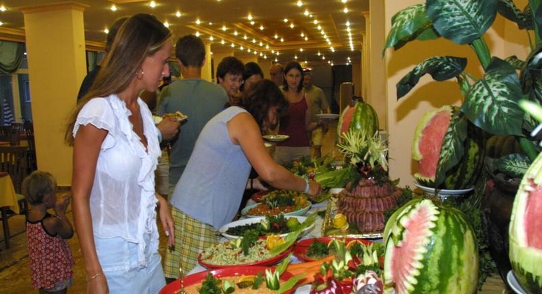 По скольку было время обеда, мы спустились на первый этаж, где находится ресторан. В ресторане нас встретил приветливый персонал, где любезно нам предложили попробовать сразу все виды блюд со шведского стола. Фруктов хватало всегда (арбузы, яблоки, апельсины, черешня, нектарин, персик, абрикос). Большое разнообразие салатов. С мясного всегда в изобилии была курица и рыба. Очень вкусные сыры и ветчина, местный хлеб всегда свежий. В баре в 11 часов начинают подавать картофель фри, колбаски и овощи -всё всегда в изобилии. Отдельное спасибо поварам Mehmet Kaya, Ferhat Akdag. Спасибо дружелюбному Мурату из бара и аниматору Рико, а также скромной женщине, которая всегда любезно готовила картофель фри у бассейна!!!
