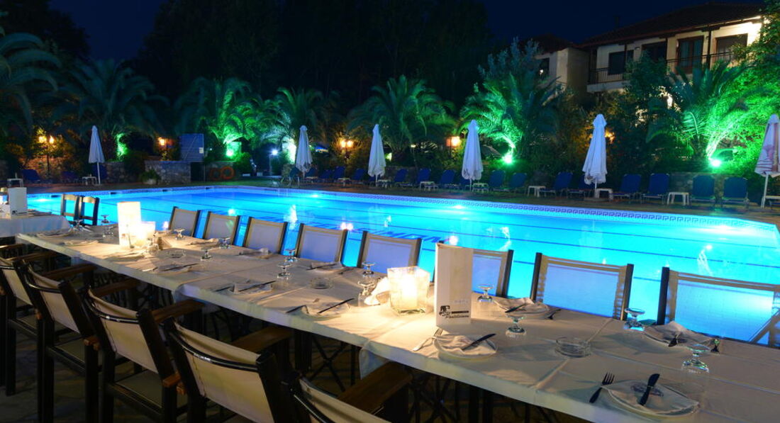 Територія та послуги: Бар біля басейну Кафе-бар Ресторан центральний та ресторан a la carte Автостоянка безкоштовна Інтернет: безкоштовний Wi-Fi у лобі Конференц-зал: зам. до 100 місць Обслуговування номерів Сейф на рецепції – за доплату Теле-зал - телехол Трансфер Автобусна зупинка за 100 м від готелю Послуга "будильник" Умови для інвалідів Розваги та спорт: Басейн із прісною водою Пляжний волейбол на пляжі Більярд біля готелю Жива музика: грецький вечір – 2 рази на тиждень (у високий сезон) Для дітей: Дитяче ліжечко безкоштовно Дитячий басейн із прісною водою Живлення: Все включено (AL), Сніданок, вечеря (HB) Пляж: Парасольки за доплату Лежаки за доплату Піщано-гальковий у 100 м Пляжні рушники за доплату До оплати приймаються кредитні картки: Visa, MasterCard.