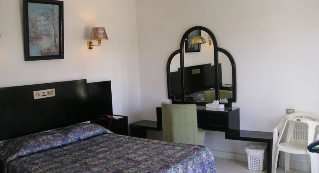 Отель совершенно не соответствует описанию и фотографиям. Когда искали тур, на фото были представлены чистые номера с относительно новой мебелью и ухоженной территорией отеля. По факту заселили в номер с обшарпанными стенами, ободранной местами мебелью из прошлого века, пыльными занавесками , текущим шлангом душа, скрипящей входной дверью и неоткрывающейся дверью балкона. Освещения никакого, света из окна ( годами немытого) тоже нет. На кровати вместо матраса лежит кусок поролона. На следующий день за 20 дол предложили переехать в "люкс номер" . Эта комната уже больше была похожа на представленные туроператором фото, но и это не избавило ее от душевой метр на метр со сломанным держателем, воняющего чьим-то потом пледа, паутины в углах, отсутствием ершика около унитаза и местами забрызганных непонятно чем стен. Искусственное освещение представлено 2мя светильниками где-то под потолком, толком света от них так же нет.