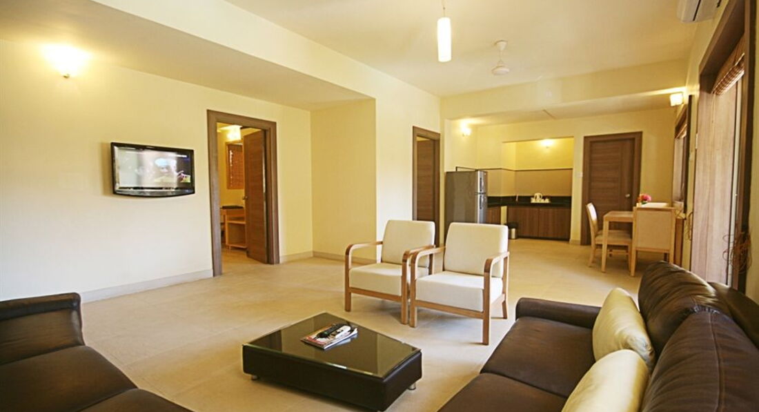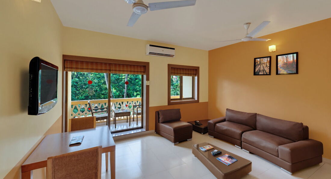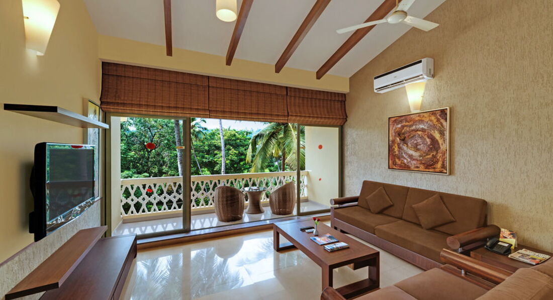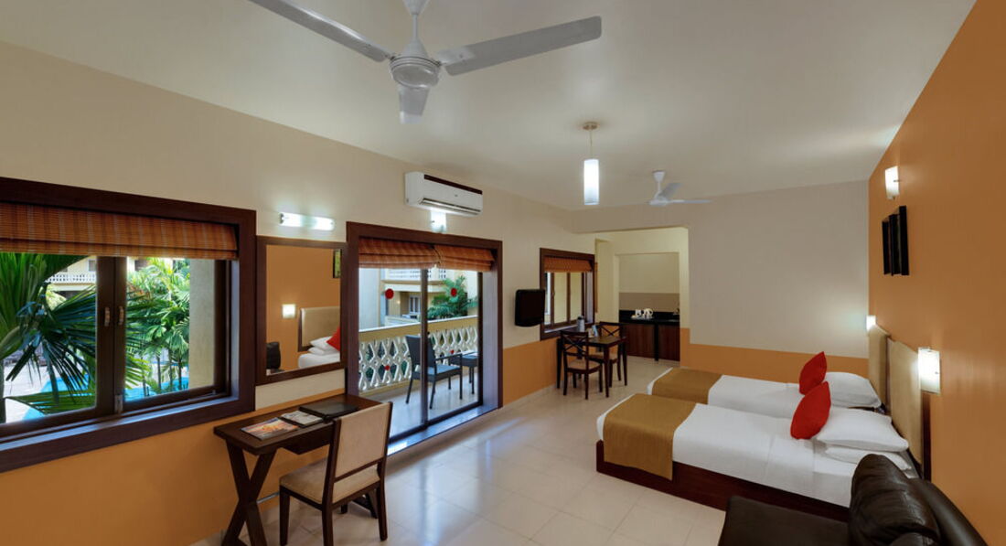 Всем привет!Отдыхали в этом отеле со 2 ноября по 9 ноября 2013 года всё некогда было отписаться.Выбрали отель из за того что он маленький так как хотелось отдохнуть от людей.Сам перелёт нас не особо утомил 7 часов туда 8 обратно.Так как после 11 часового перелёта в Доминикану это ни чего.Прилетели на Гоа где то в три часа утра по местному времени.В аэропорту таможня тормозит каждые 10 метров для проверки документов это утомляет.В отель приехали в 5 утра с аэропорта ехать минут 40.Заселение-Заселили только в 12.00 предлагали деньги что бы быстрей заселили но фигу.Так что рассчитывайте тур что бы с утра не прилететь ни какие деньги не помогут.Обидно было то что группы лётчиков и американских туристов просто толпы заселяли в течении 10 минут а ты сидишь потный и уставший смотришь на это б... ругайся не ругайся раньше не заселят.Правда один раз женщину с ребёнком за деньги заселили сразу.Номер-Номер мы бронировали сьют очень приличный по размерам и довольно уютный.Большая гостиная с кожаным диваном телевизор столик и большой балкон с видом на маленькую территорию отеля типа мини сад.Отдельная спальня также с телевизором с большой кроватью встроеные шкафы столик для женщин с зеркалом и в гостиной и в спальне есть кондиционер и потолочные вентиляторы.Есть что то типа мини кухни и небольшой холодильник,чайник,плиты нету.Чай в пакетиках,кофе,сухое молоко,сахар и заменитель сахара добавляли всегда.Воду ставят только один раз при заселении далее покупаете сами.Территория-Территория у отеля отсутствует есть небольшой ухоженный садик и всё.Питание-Питание брали завтрак и ужин мягко говоря очень и очень скромное.Мяса было два вида курица и рыба острая и не острая на этом с мясом всё и были фрикадельки правда я так и не понял из чего.А остальное из еды рис со специями и без какие то овощи тушёные,лепёшки,булочки,свежие помидоры,огурцы из фруктов были арбуз,дыня,ананас и ещё какие то красные сладкие ломтики забыл название.Вечером было и мороженое.Можно заказывать еду из меню но уже за отдельную плату.Внутри в ресторане стоит типа поднос со льдом там лежали какая то рыба лангусты можно их заказать.Рядом нет ни одного кафе и магазина надо ехать на такси кстати такси не дорогое можно и поторговаться.Пляж-Пляж маленький но чистый народу мало лежаков нам всегда хватало.На выходные приезжают индусы с других районов тогда с лежаками проблема но есть коврики выдаёт охранник так же как и полотенца говорите свой номер и он записывает когда уходите то сдаёте.С лежаками мы делали так когда с пляжа уходили то кому их не хватало то подходили к тем кто на песке лежал загорал то есть к россиянам и говорили что уходим занимайте скорей мы свои полотенца убирали и они сразу свои ложили.Местные индусы которые неподалёку ждали момент когда лежак освободится были в недоумении от такой тактики похоже не сталкивались с такими делами.Надо же помогать землякам.После обеда был отлив и можно было пройти на дикий пляж если смотреть на море то он находится с лева.Там можно и сделать красивые фотки на фоне красно-коричневых камней и вода чище так как там не только песок но и мелкая галька.Можно набрать много красивых ракушек для аквариума мы себе набрали.На отельном пляже при входе в море вода мутная из за того что песок тёмный.Вечером к берегу прибивает от куда то мусор плавают бут