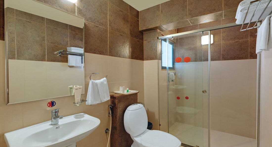 Номер большой - 42 кв.м. (есть и меньшие, по 21 квадрату, есть и бОльшие), чистый, хорошо обставленный, 3 потолочных вентилятора, кондиционер, ЖК-телевизор, большая кровать, удобный большой душ, полотенца и наволочки меняют каждый день (насчет постельного белья просто не отмечал, всё было чисто). Есть набор для чая (чайник-чашки-ложки- подносы), небольшой холодильник (но и не мини-бар).