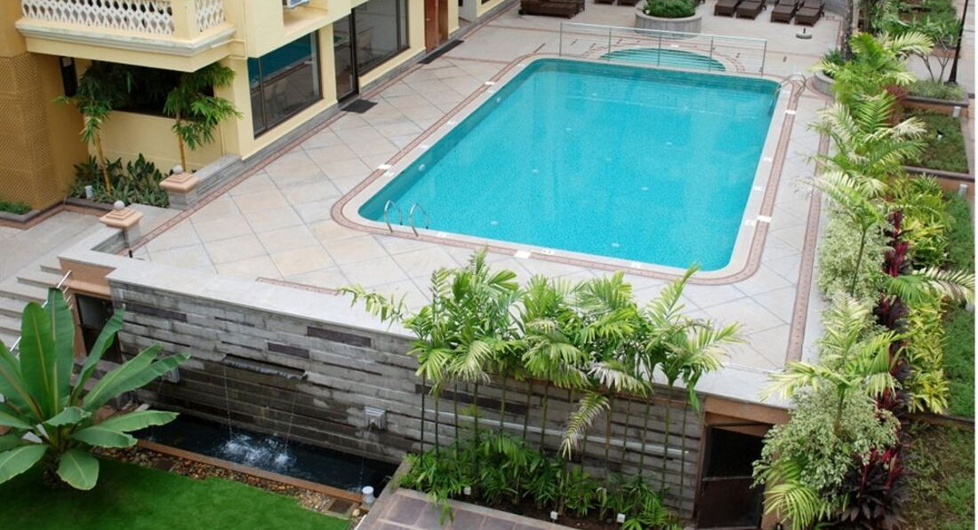 Бассейн есть, но мелкий и воняет хлоркой. Дети индусов в нем любят прыгать и очень громко кричать. Т. К. Здания расположены по кругу и внутри " колодца" бассейн, то слышимость очень хорошая.