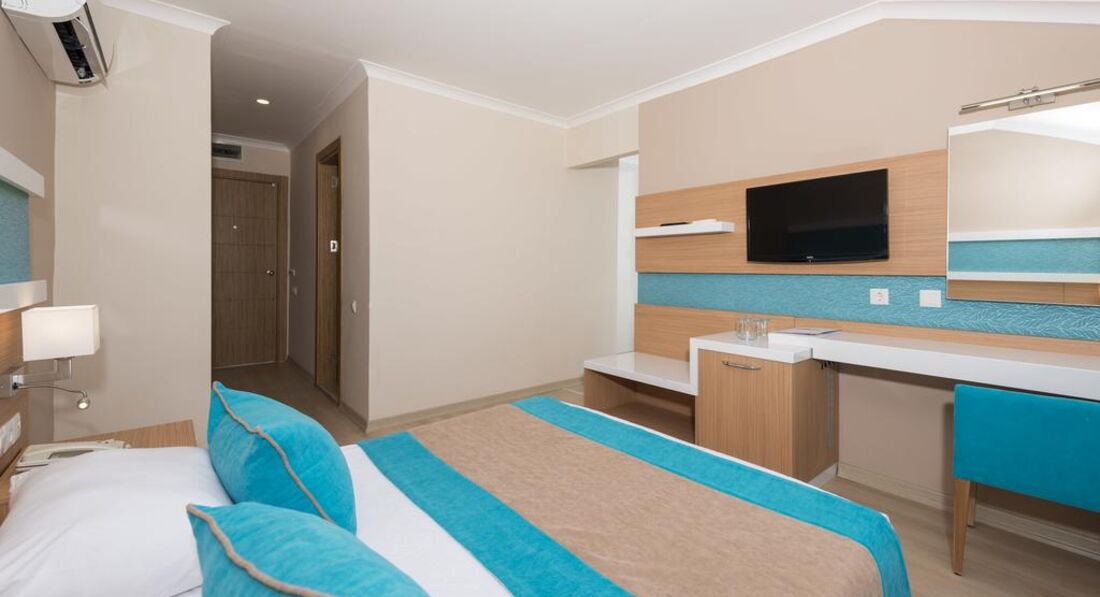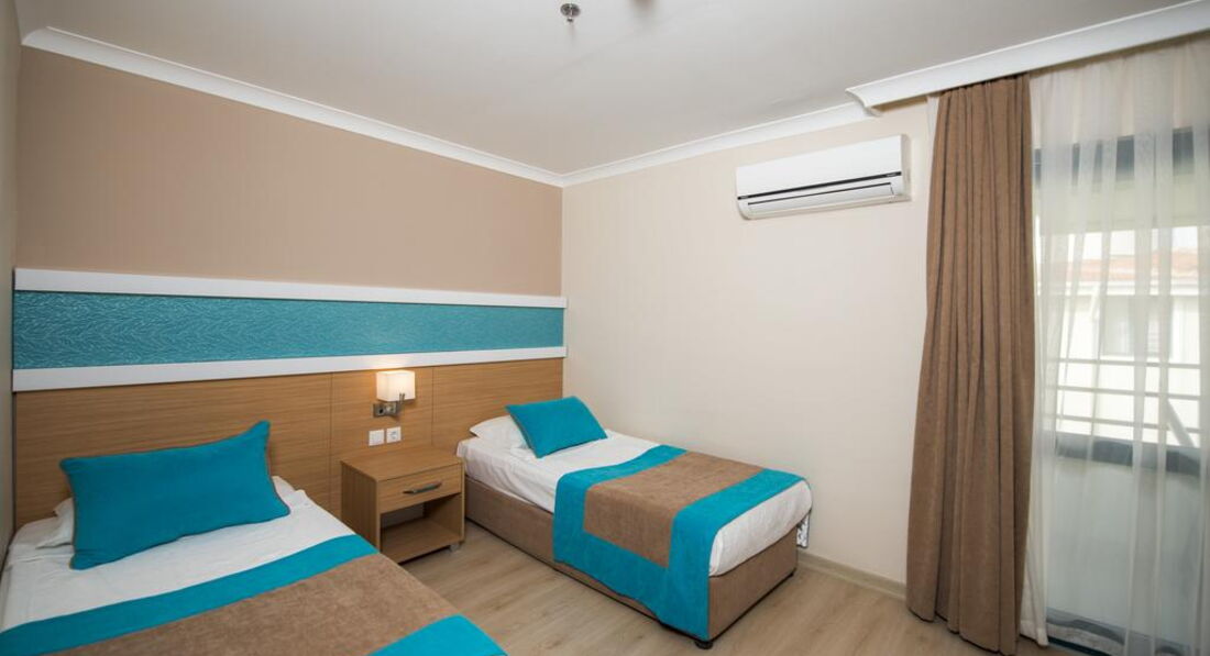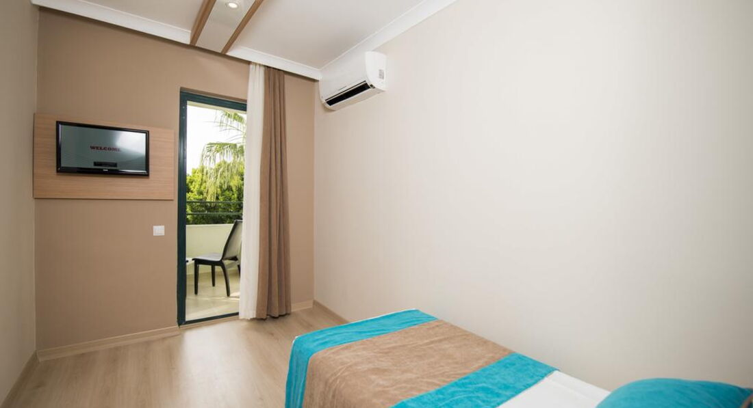 Типи номерів: • 195 standard room (макс. 3 чол., 23 м2) • 66 однокімнатних family room (макс. 4 чол., 33 м2)У номері: • сейф: у номері, платно • зміна білизни: 3 рази на тиждень • кондиціонер: індивідуальний • телефон • підлога: ламінат • прибирання номера: щоденно • фен: є • російських каналів: 1 • міні-бар безкоштовно (вода на день заїзду) • балкон • душ • Інтернет: Wi-Fi, платно • телевізор