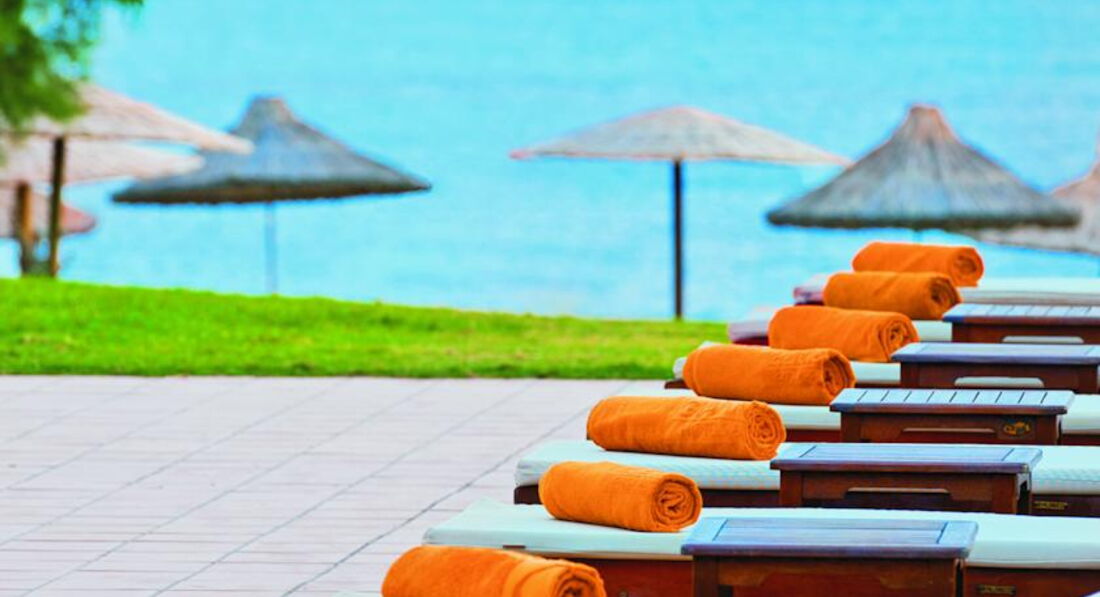 •Піщаний пляж біля готелю. Шезлонги, парасольки платно