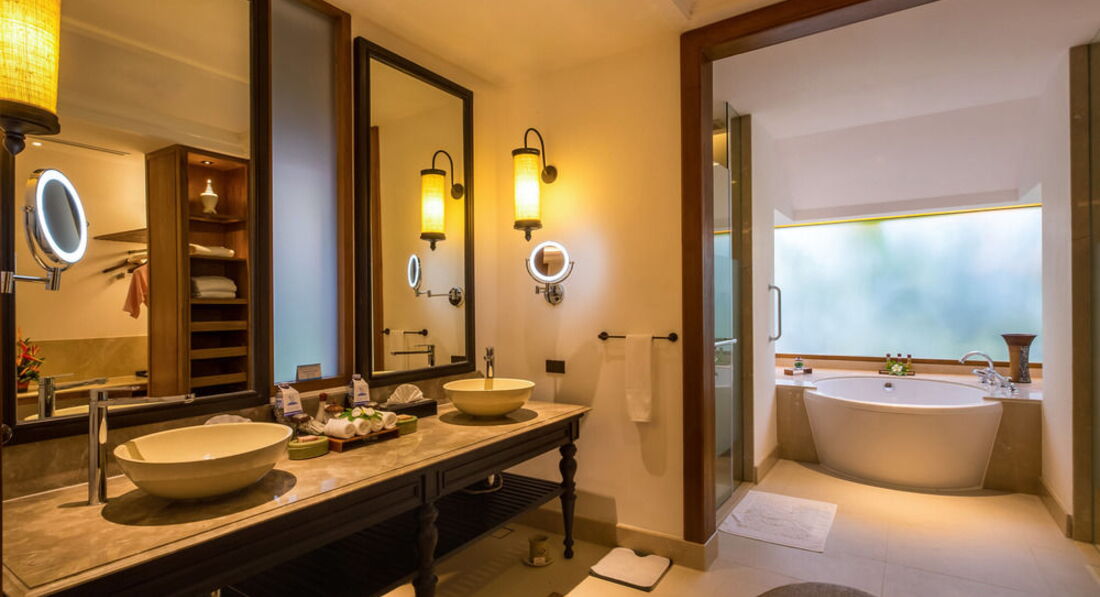 У нас был заказан номер трехместный люкс ( дуплекс, двухэтажный). Без предупреждения и какого- либо объяснения нас селят в виллу 405. Наверно, это категория выше. ( Хотя?) Но можно было нам объяснить как-то причину и предложить, а не поставить перед фактом. На вилле маленькая гостевая комната , где кушетка, превращенная в кровать, телевизор, холодильник, капсульная кофемашина,чайник, небольшой столик. Сын, который ростом 195 см , едва,конечно помещался на этой кушетке. Без комфорта. Гостевая перетекает в спальню ( отделяется одна комната от лругой дверьми на колесиках). В спальне темновато, как , впрочем и во всем бунгало. Понимаю, тропики, зелено, но мы любители света. Ладно, к этому привыкли. В спальне широкая кровать, две тумбочки и ьелевизор ( два русских канала). Матрас на любителя, мне так жестковат. К белью вопросов нет. Из спальни развижная дверь в ванную- туалет. Там: две раковины, кругоая ванна, унитаз и душ, гардеробная. Странно было вот что. Если задумал покупаться в ванной, то наполнить теплой водой ты ее сможешь только наполовину,т к потом теплая вода кончится. Для " пятерок" это нонсенс. Лимит горячей воды- мы с таким еще не встречались. Да, справедливо, что в ванной есть все моющие принадлежности, а также пляжная сумка и сланцы. Это хорошо. Но горячая вода должны быть постаянно и без ограничения!